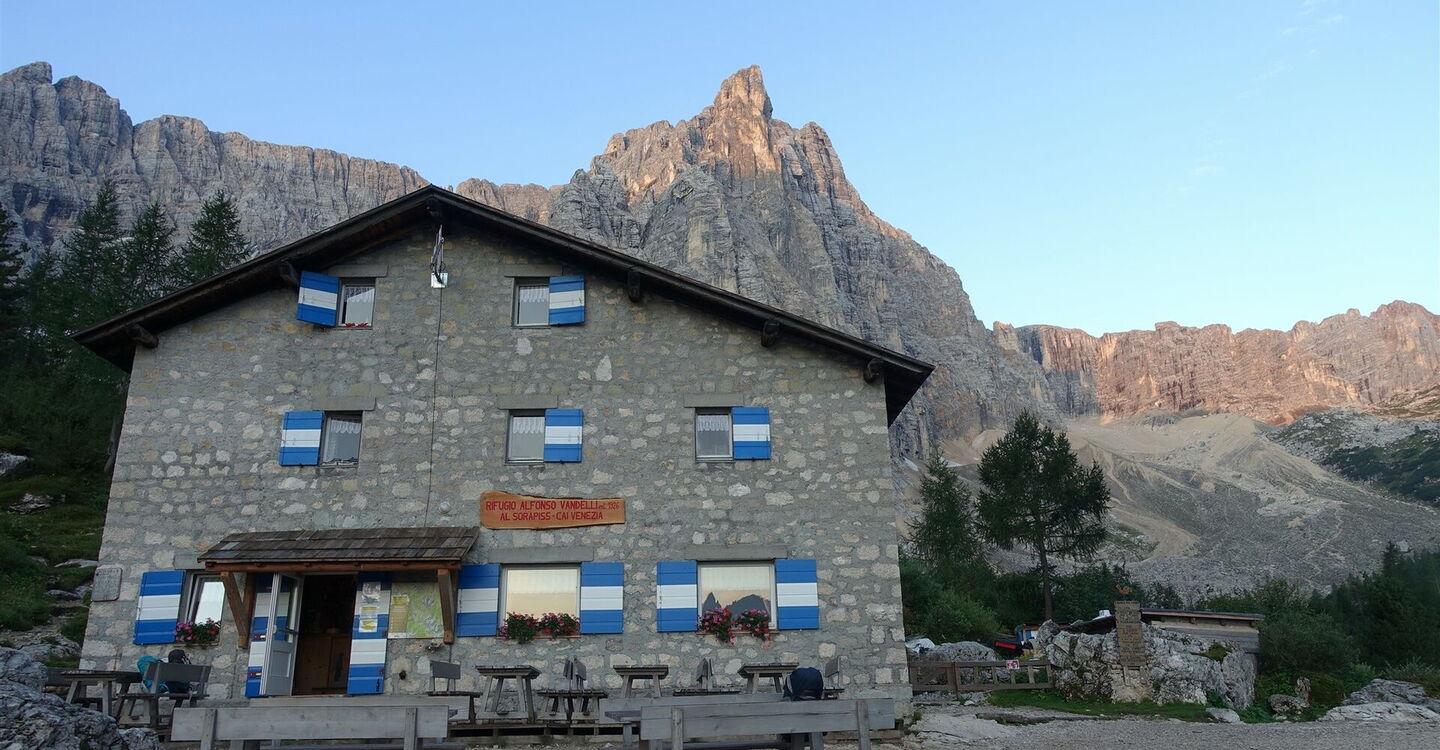 Bis auf die zwei kurzen Teilstücke entlang einer Straße erwartet uns eine landschaftlich faszinierende Etappe. Den Auftakt bildet die wunderschöne Aussicht vom Rifugio Maggiore Angelo Bosi: Richtung Osten die Drei Zinnen und in südöstlicher Richtung die höchsten Gipfel der Cadinigruppe mit der 2.820 m hohen Cima Eötvös und der 2.839 m hohen Cima Cadin di San Lucano. Sie bilden den südlichen Abschluss der Sextner Dolomiten. Der nächste Höhepunkt ist das abgelegene Valle di Popena, benannt nach dem 3.152 m hohen Piz Popena. Neben dem Monte Cristallo und der Cima di Mezzo ist er einer der drei Cristallino di Misurina. Der Aufstieg zum Rifugio Vandelli führt an einem kleinen Wasserfall vorbei. Oberhalb der Baumgrenze schaut man dann über das Val Sorapiss bis zu den Sextner Dolomiten, nun von Süden. Hinter dem Rifugio Vandelli liegt der malerische Lago di Sorapiss mit der Felsnadel Dito di Dio. Auf dieser Etappe lohnt es sich, immer wieder innezuhalten und sich von der Natur verzaubern zu lassen.