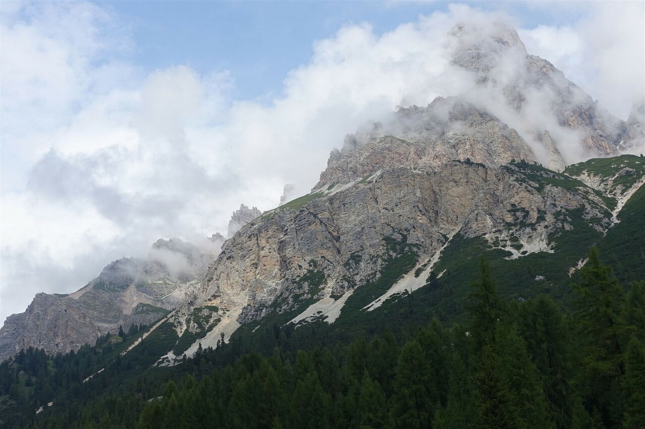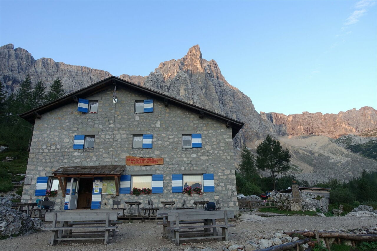 Auf dem Sentiero 215 gehen wir links Richtung Rifugio Vandelli. Zunächst führt der Pfad gemächlich durch den Wald, aber hinter einem Wasserfall wird der Anstieg dann steiler. Bei der darauffolgenden Weggabelung gehen wir halb rechts, der Arm ist auch ausgeschildert Richtung Rifugio Vandelli. Dann geht es über Metalltreppen und einen schmalen, mit Stahlseilen gesicherten Pfad, für den Trittsicherheit und Schwindelfreiheit ein Muss sind. Der Wanderweg gabelt sich abermals, links führt der Wanderweg 243 zum 05 Rifugio Vandelli (1.928 m), rechts führt der Wanderweg 215 zum Lago del Sorapiss.