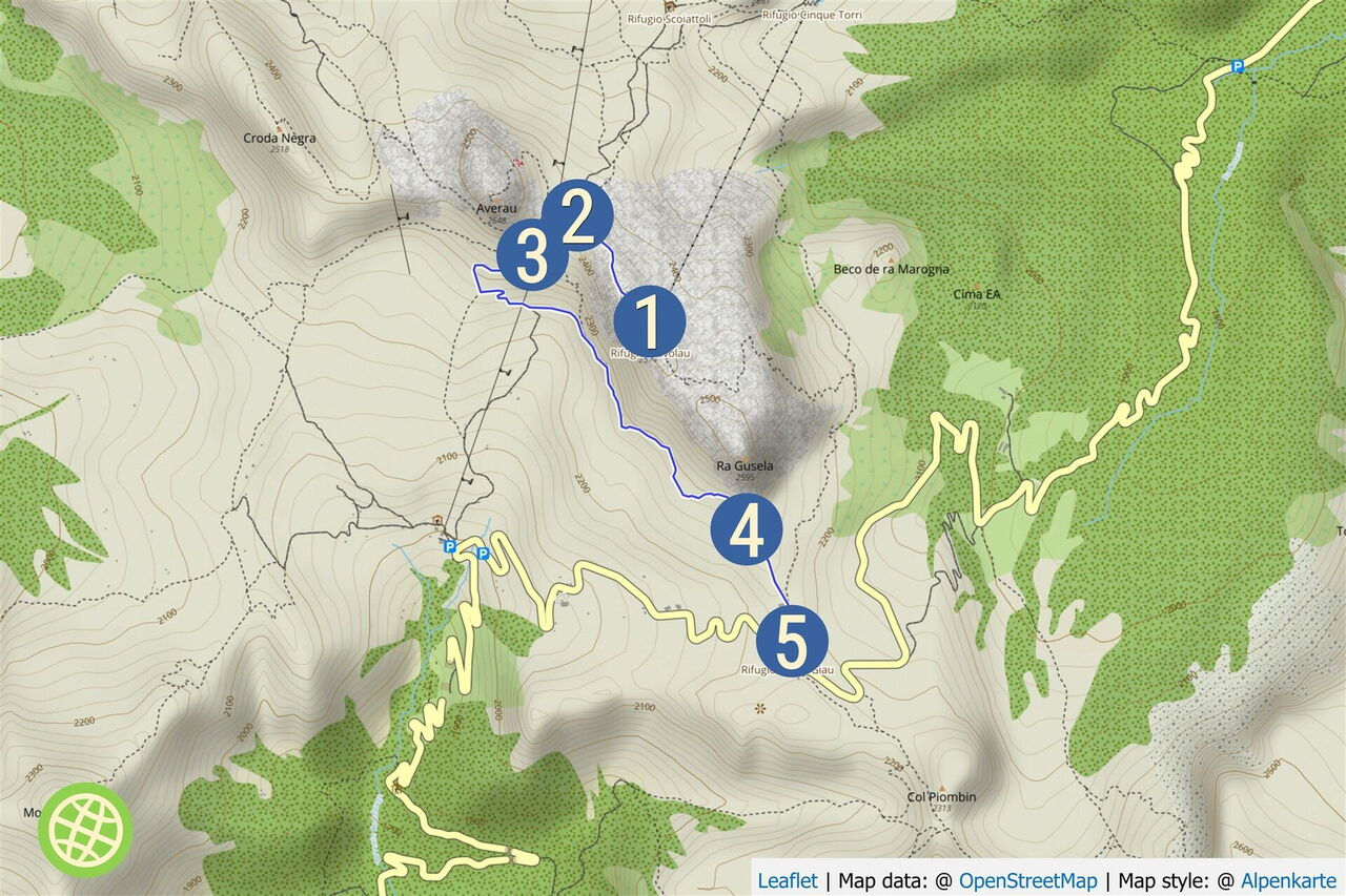 Das Gelände ist einfach und kann ohne spezifische Übung von jedem gemeistert werden. Art des Weges: 100 % Pfad. Zusatzausrüstung: keine. Einkehr: km 0,8 Rifugio Averau. Beste Wanderzeit: Mitte Juni bis Mitte September.