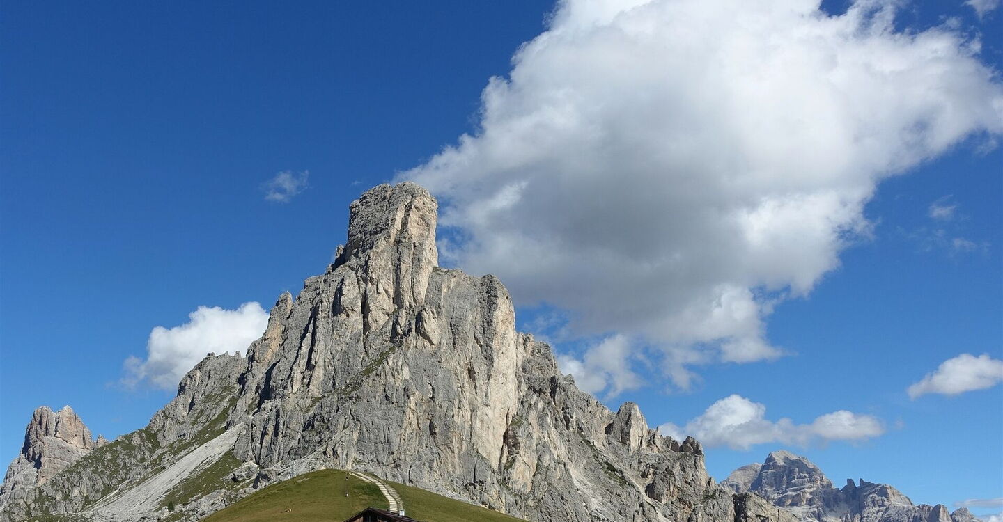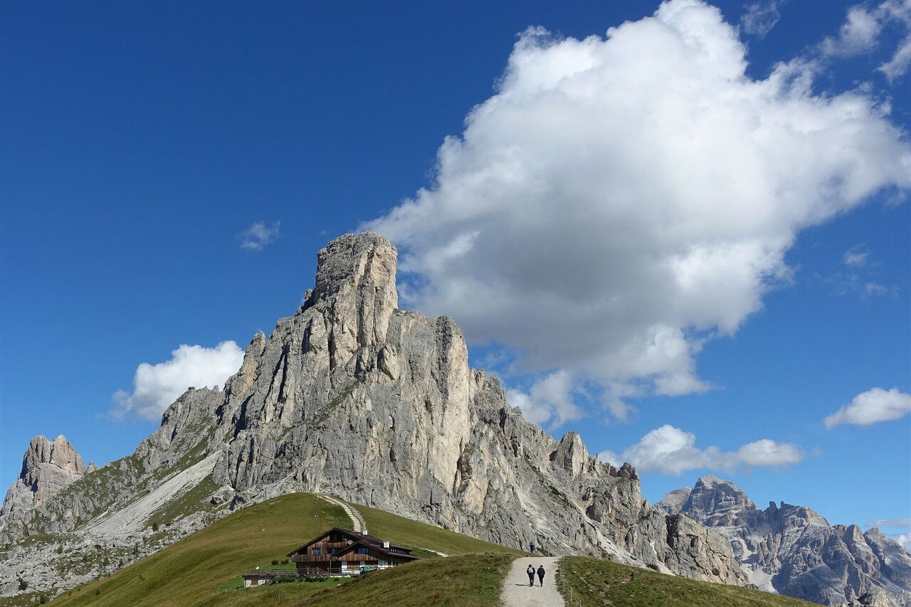 Sobald wir wieder Bergwiesen erreichen, wird der Pfad zum breiten Wanderweg. Vor einem großen Haus mündet von scharf links der Wanderweg 444 in den unsrigen. Dieser kommt vom Rifugio Cinque Torri und dem Klettersteig Via Ferrata Ra Gusela (Wanderweg 438). Auf dem breiten Wanderweg geht es bequem zum 05 Passo Giau (2.236 m) mit dem gleichnamigen Berggasthof.