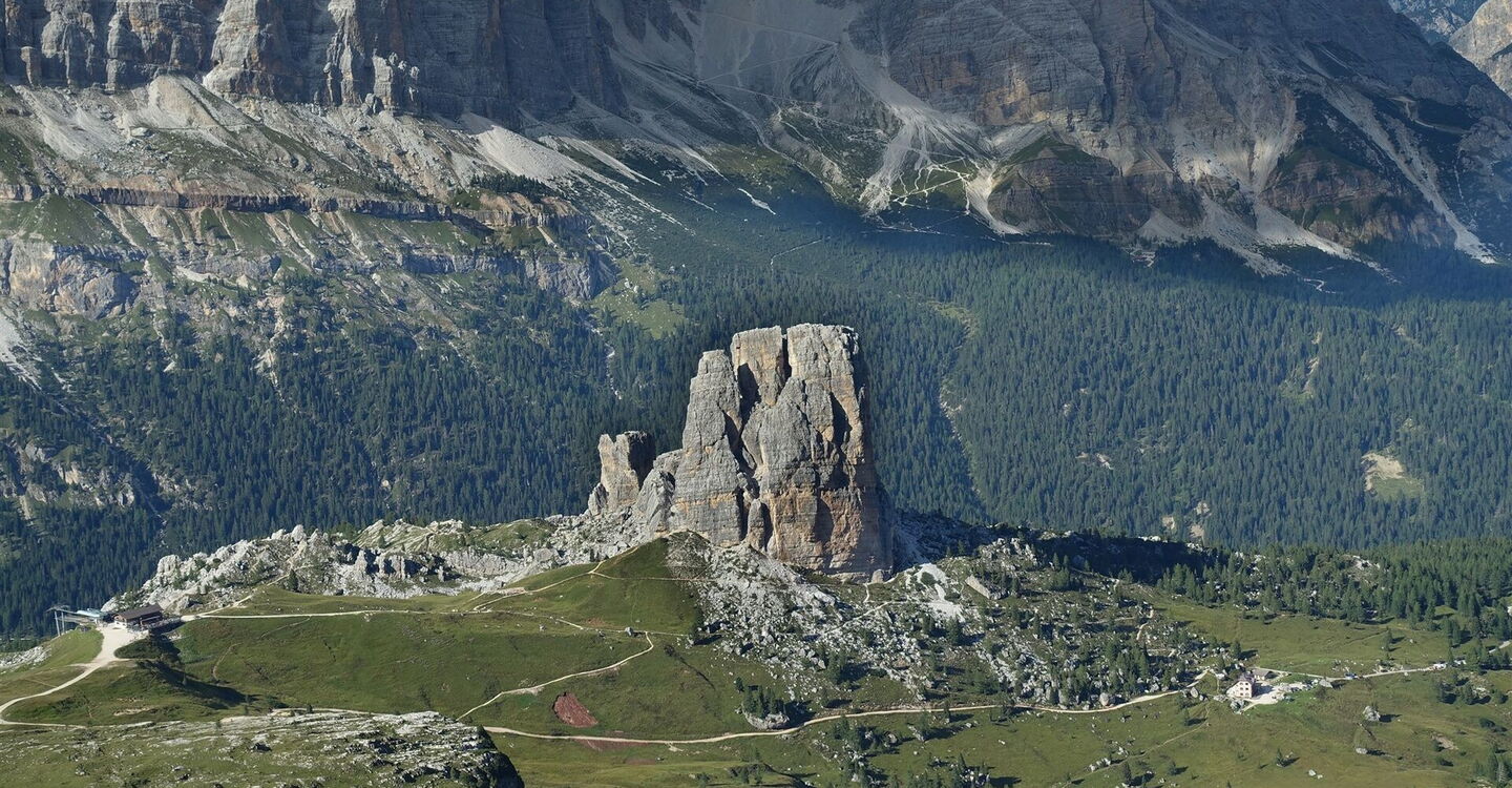 Vom 01 Rifugio Nuvolau (2.575 m) wandern wir auf dem felsigen Bergrücken auf dem Wanderweg 439 in westliche Richtung talwärts. Je weiter wir bergab steigen, umso höher erhebt sich vor uns der 2.649 m hohe Monte Averau (siehe Tour 25).