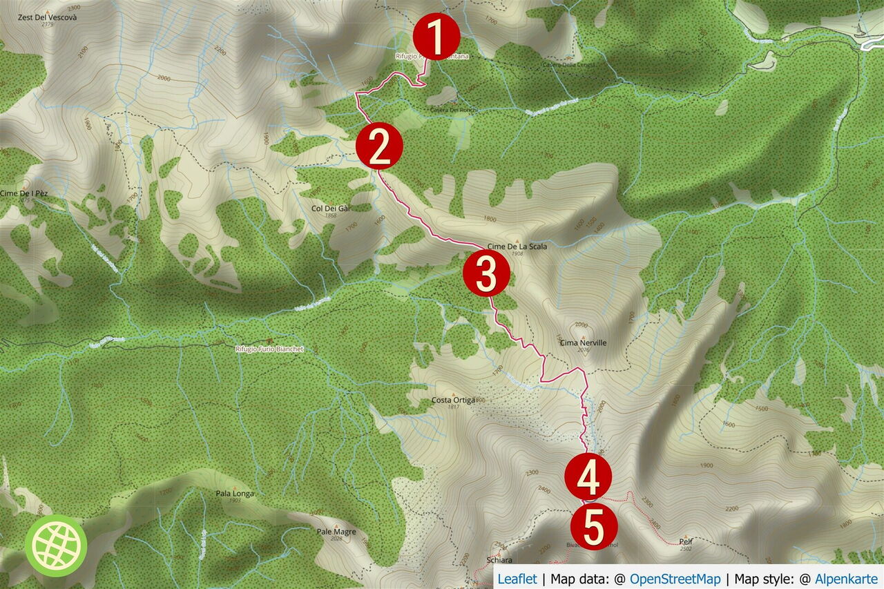 Startpunkt: Die Tour beginnt am Rifugio Plan de Fontana. Es ist nur zu Fuß erreichbar und befindet sich am Ende der Tour 18. Endpunkt: Das Bivacco del Màrmol ist nur zu Fuß erreichbar und befindet sich am Anfang der Tour 20.