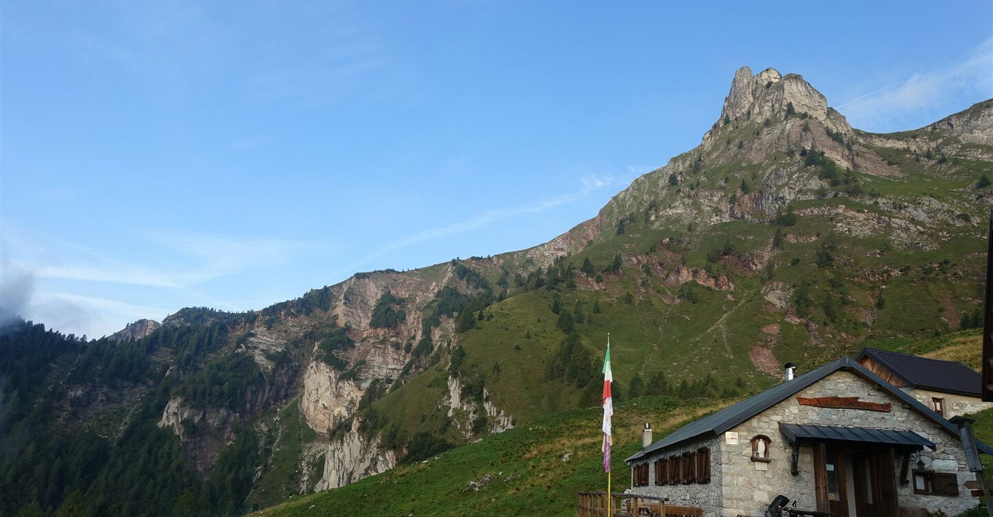 Wir erreichen die 02 Forcella La Varetta (1.704 m), rechts geht es zu der Casera La Varetta, wir gehen aber links Richtung Forcella del Marmol. Wir wandern auf einem extrem steil abfallenden, mit Gras bewachsenen Berghang. Unterhalb sieht man das Rifugio Furio Bianchet, direkt vor uns erhebt sich der mächtige Felskloß des 2.565 m hohen Schiara.
