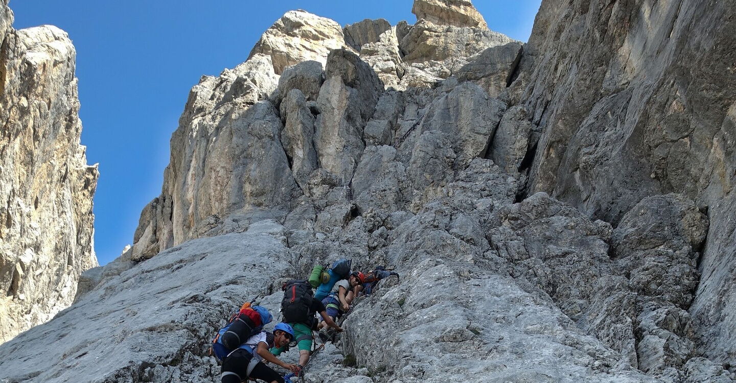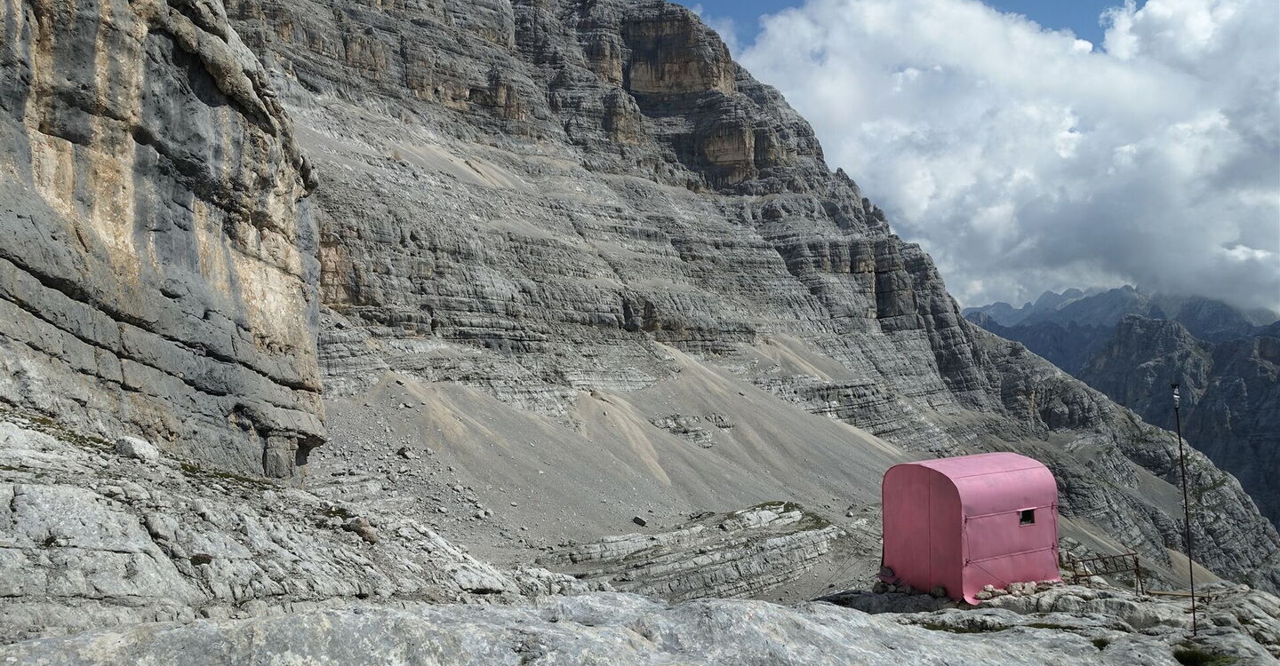 Zum krönenden Abschluss geht es dann auf einem sehr schmalen Felsband inmitten einer senkrecht abfallenden Felswand – zum Glück an einem durchlaufenden Sicherungsseil – bis zur Forcella del Bivacco hoch, dem höchsten Punkt der heutigen Etappe. Von dort geht es auf dem Wanderweg 246 nur noch wenige Meter bergab bis zum 05 Bivacco Slataper (2.600 m).