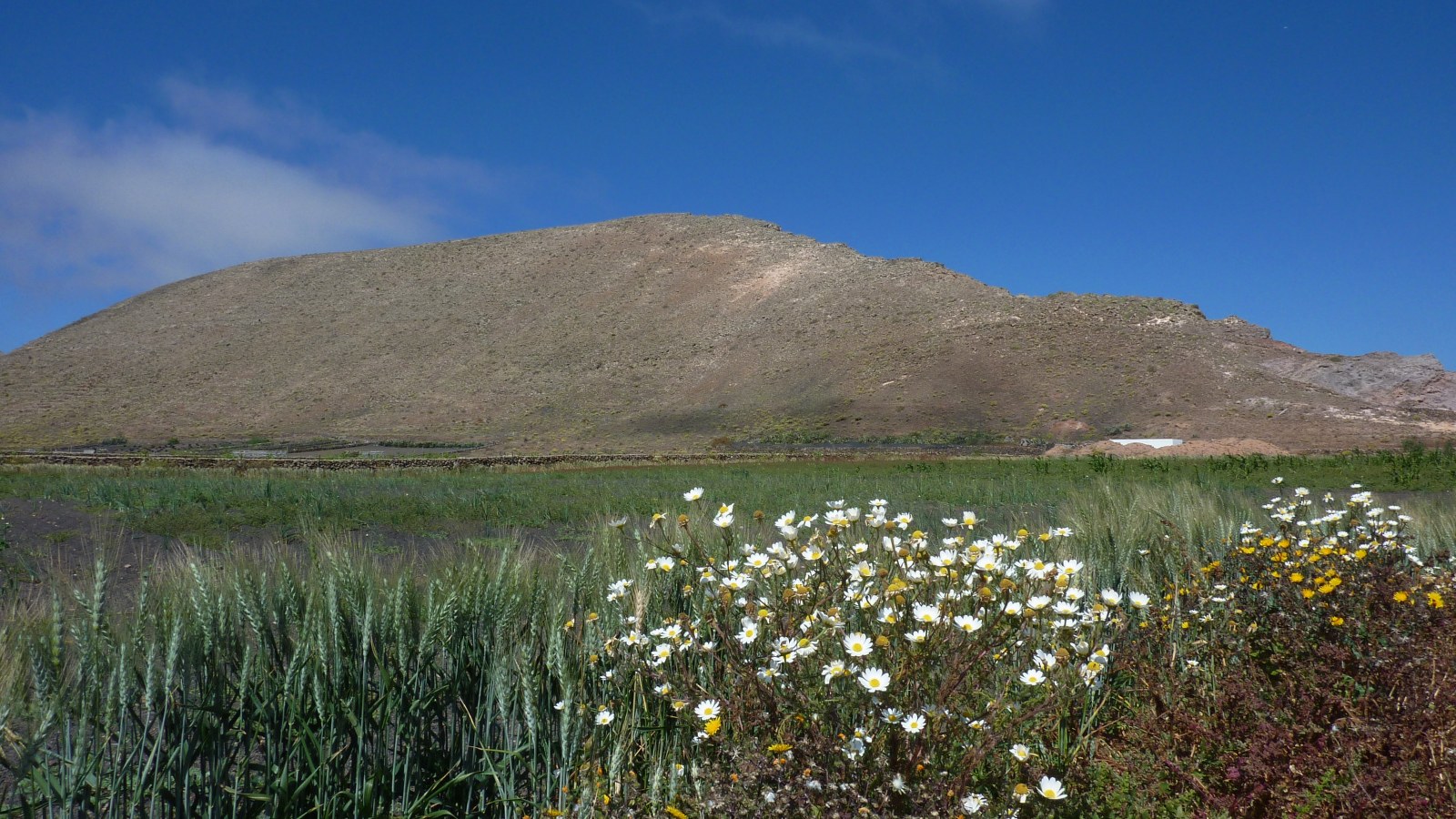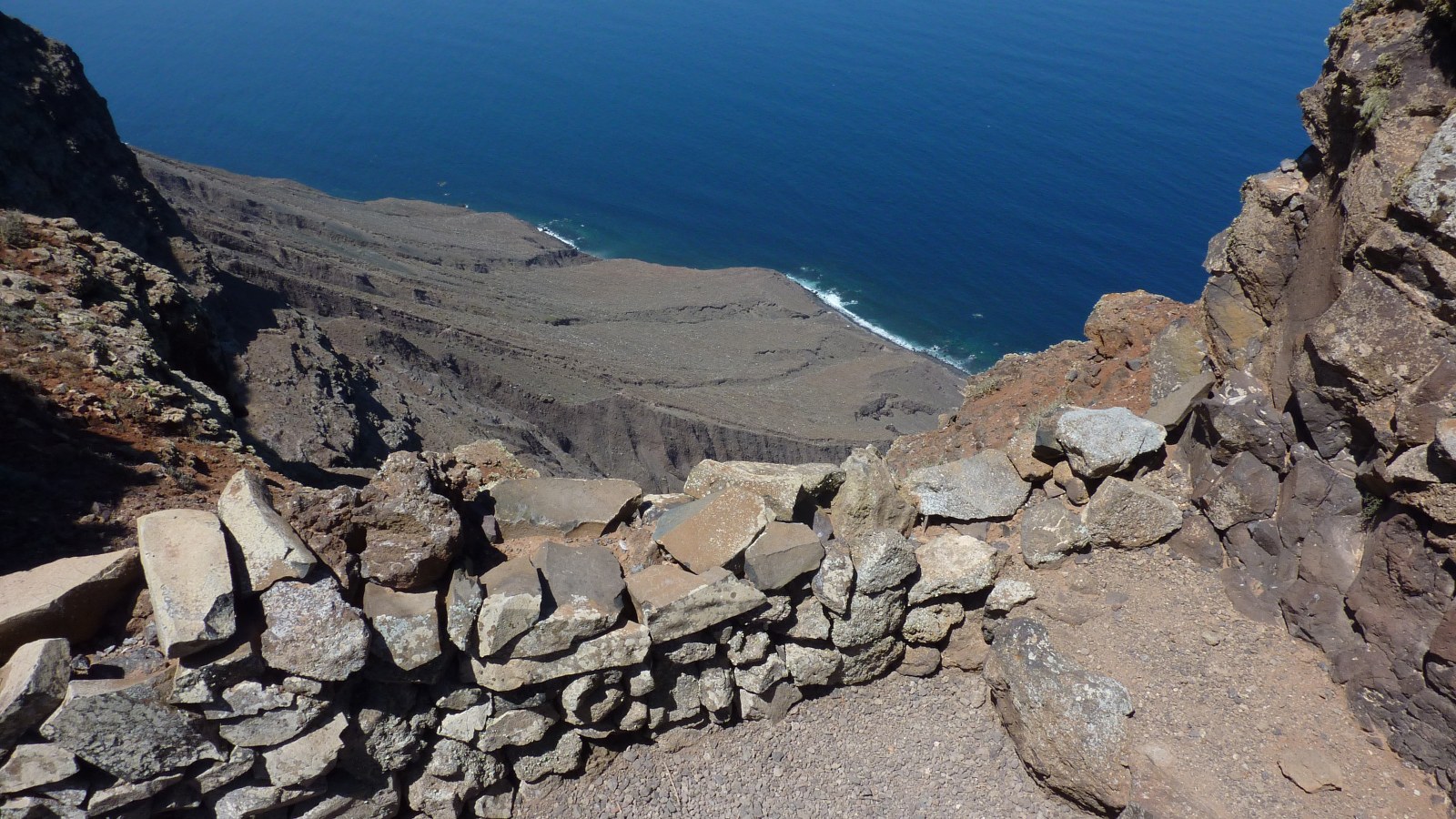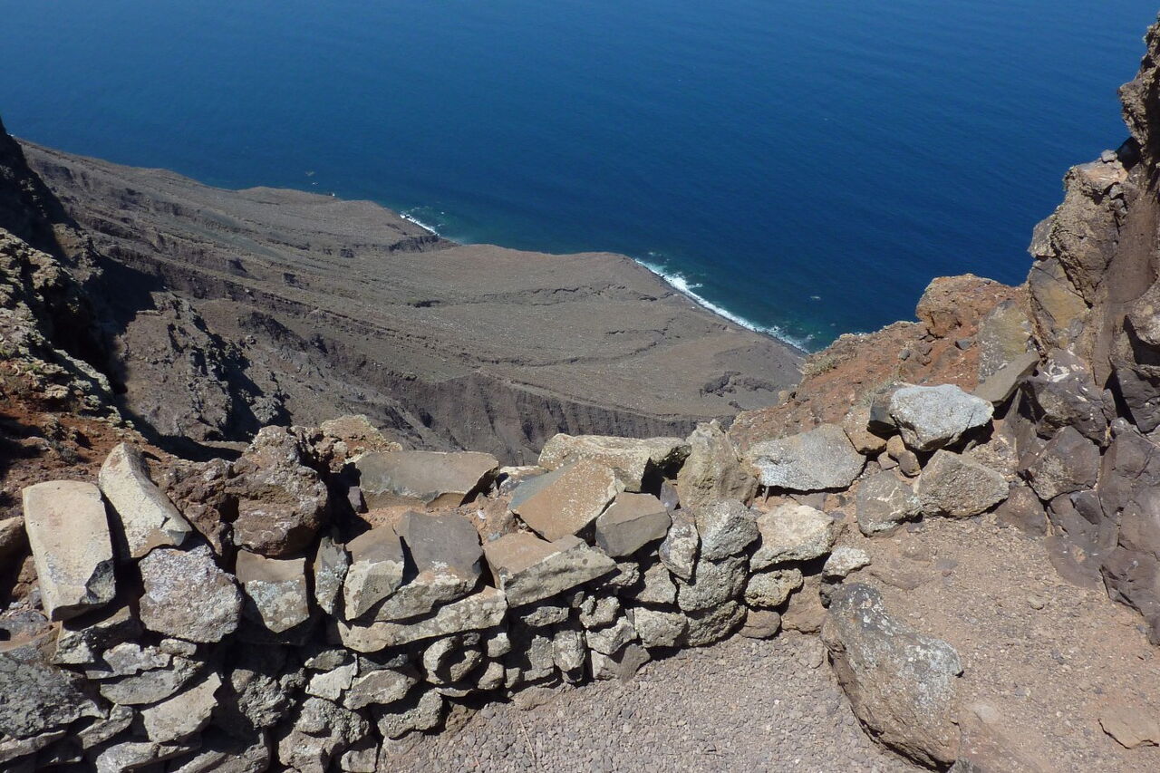 Parallel zu unserer Gratwanderung verläuft im Talgrund ein Wirtschaftsweg, zu dem wir im weiteren Verlauf der Wanderung absteigen werden. Der Pfad führt durch brachliegende, terrassenförmig angelegte Felder, bis wir nach einem kurzen Stück bergab den (03) Mirador (475 m) erreichen. Von diesem beeindruckenden Aussichtspunkt schaut man senkrecht zum Atlantischen Ozean herunter und entlang der Steilküste des Risco-de-Famara-Gebirgsmassivs. Vom Mirador steigen wir direkt zum Wirtschaftsweg ab und gehen dann rechts bergauf weiter.