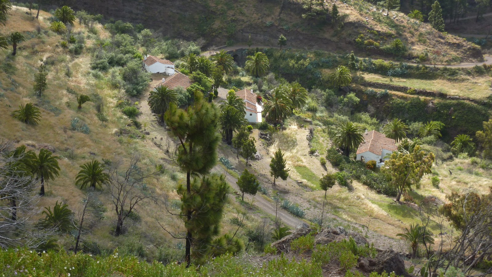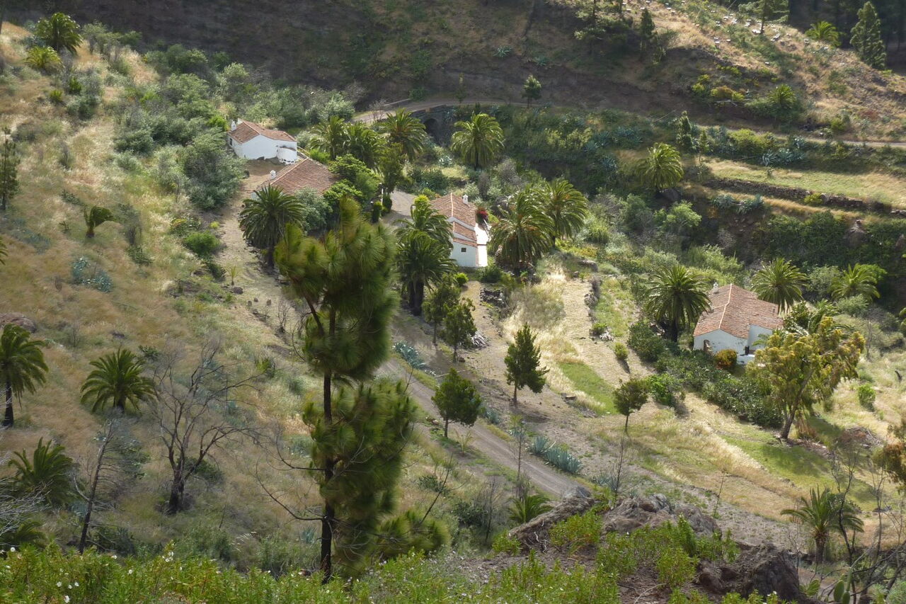 Nach 2,5 km erreichen wir eine Piste und das malerisch gelegene Dörfchen (02) Benchijigua (643 m). Mithilfe von EU-Geldern und finanzkräftiger Unterstützung des Reeders Fred Olsen wurden an dieser Stelle Fincas im altkanarischen Stil restauriert. Diese stehen nun den Urlaubern als Ferienhäuser zur Verfügung. Geht man direkt hinter der Casa Benchijigua halb rechts weiter, so erreicht man die bescheiden gehaltene Kapelle Ermita de San Juan (Las Cabezadas) aus dem letzten Jahrhundert. Für den weiteren Weg gehen wir direkt hinter der Casa Benchijigua rechts auf der Piste weiter und queren auf gleicher Höhe das Dorf, bis die Piste eine Linkskehre macht und wir einen Staudamm unterhalb von uns liegen lassen. An dieser Stelle geht die Piste in einen Pfad über.
