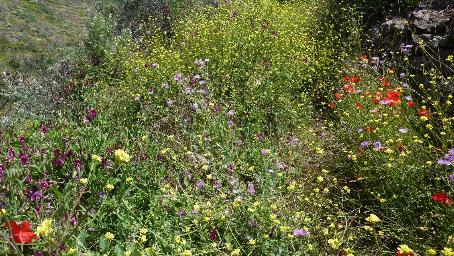 Im Frühjahr läuft man in dem folgenden Abschnitt durch ein hüfthohes Blumenmeer. Wir bleiben auf dem Weg, bis wir auf den (04) Imada Abzweiger zwei (1088 m) treffen. Wir ignorieren den Abzweiger nach links und gehen weiterhin geradeaus und bergauf. Auf der Forststraße angekommen, lassen wir den linken Abzweiger liegen und laufen weiterhin geradeaus, bis wir einen markanten Eukalyptusbaum erreichen. An dieser Weggabelung wandern wir halb links, bis wir kurz die GM-2 tangieren und dort halb rechts weitergehen, um nach 20 Metern links den Pfad nehmen. Schon bald erreichen wir den nächsten Höhepunkt - den Mirador de Tajaque. Es eröffnen sich atemberaubende Weitblicke auf die Schlucht von Benchijigua über Alajeró und bis hin zum Playa de Santiago.