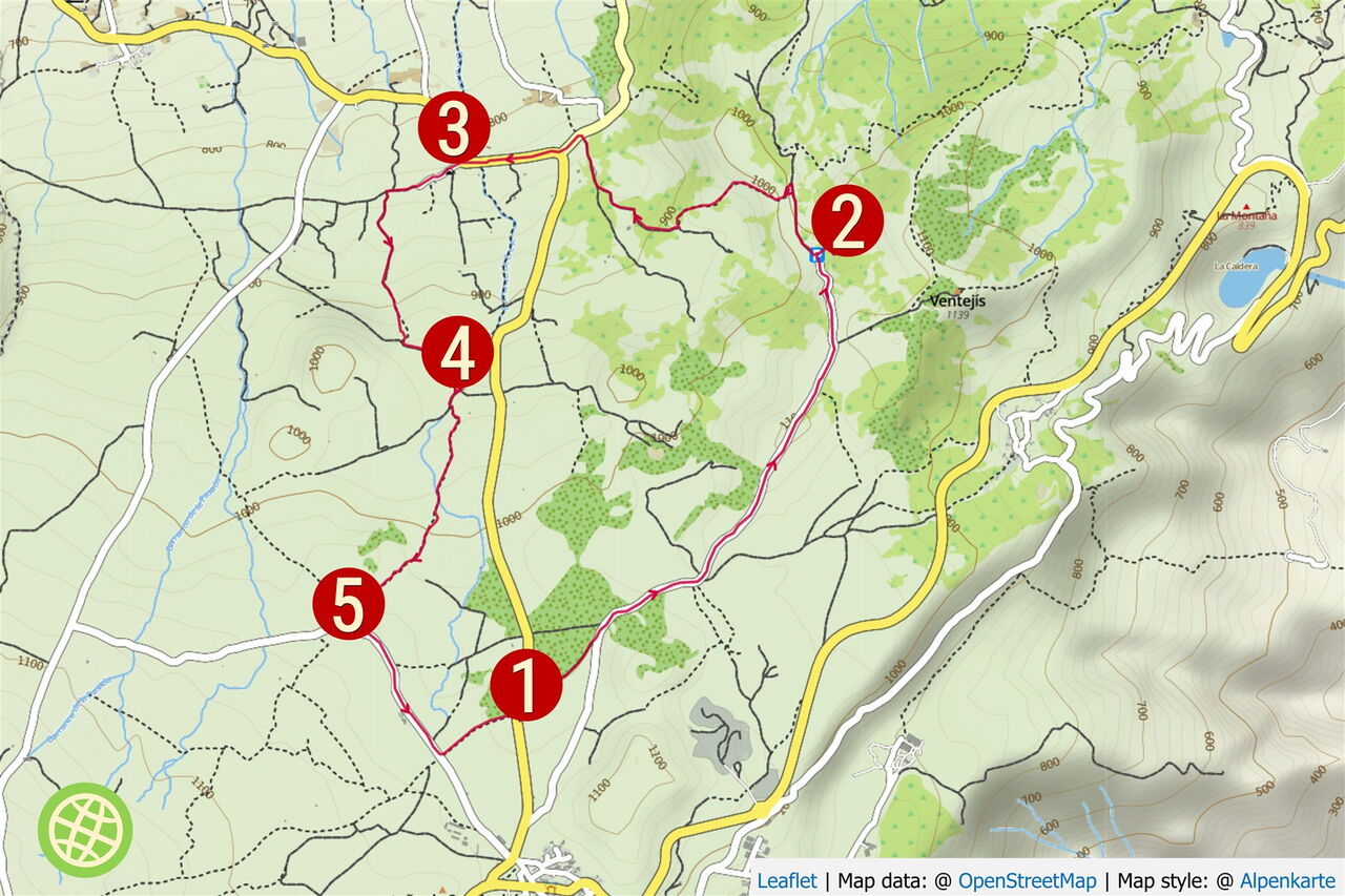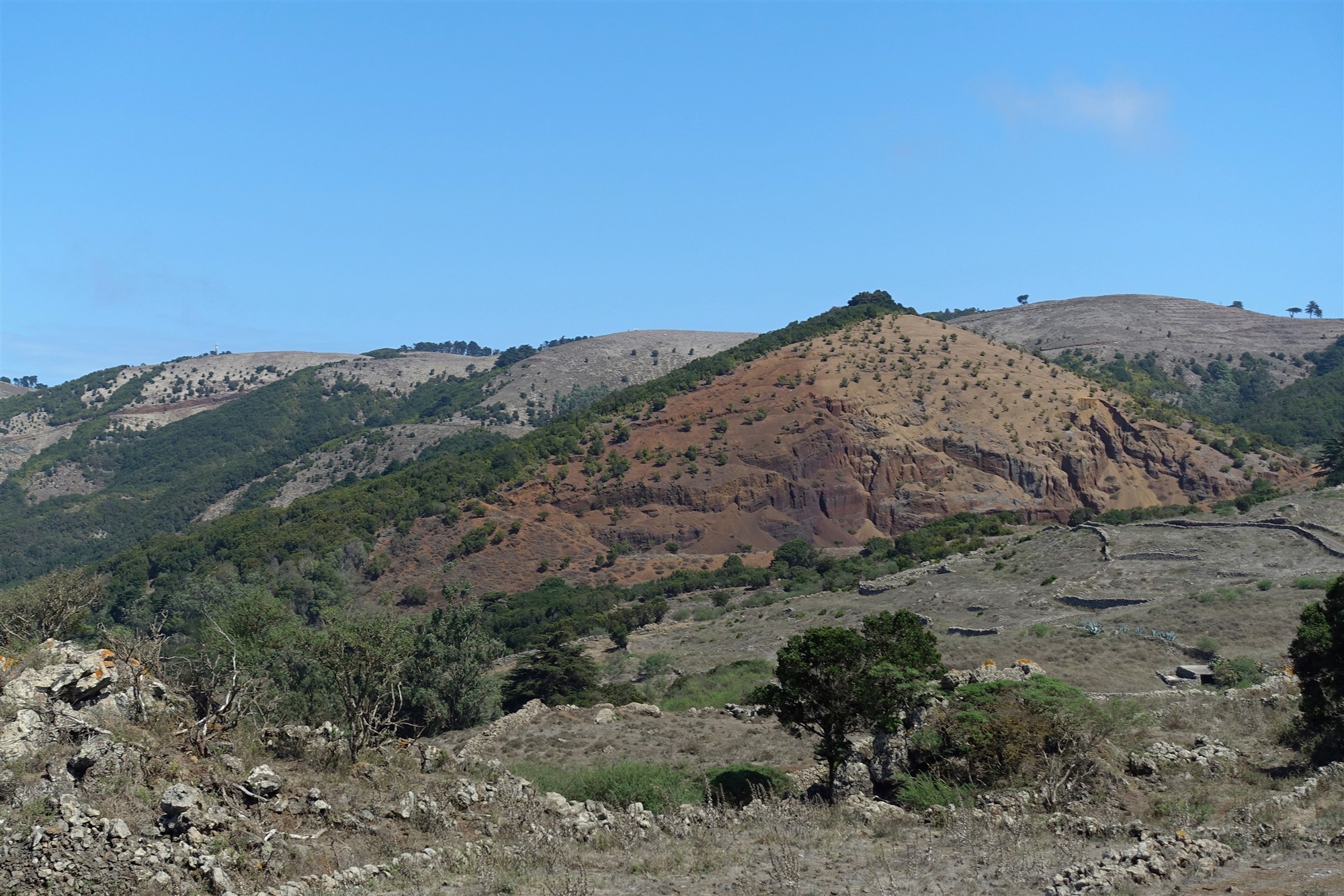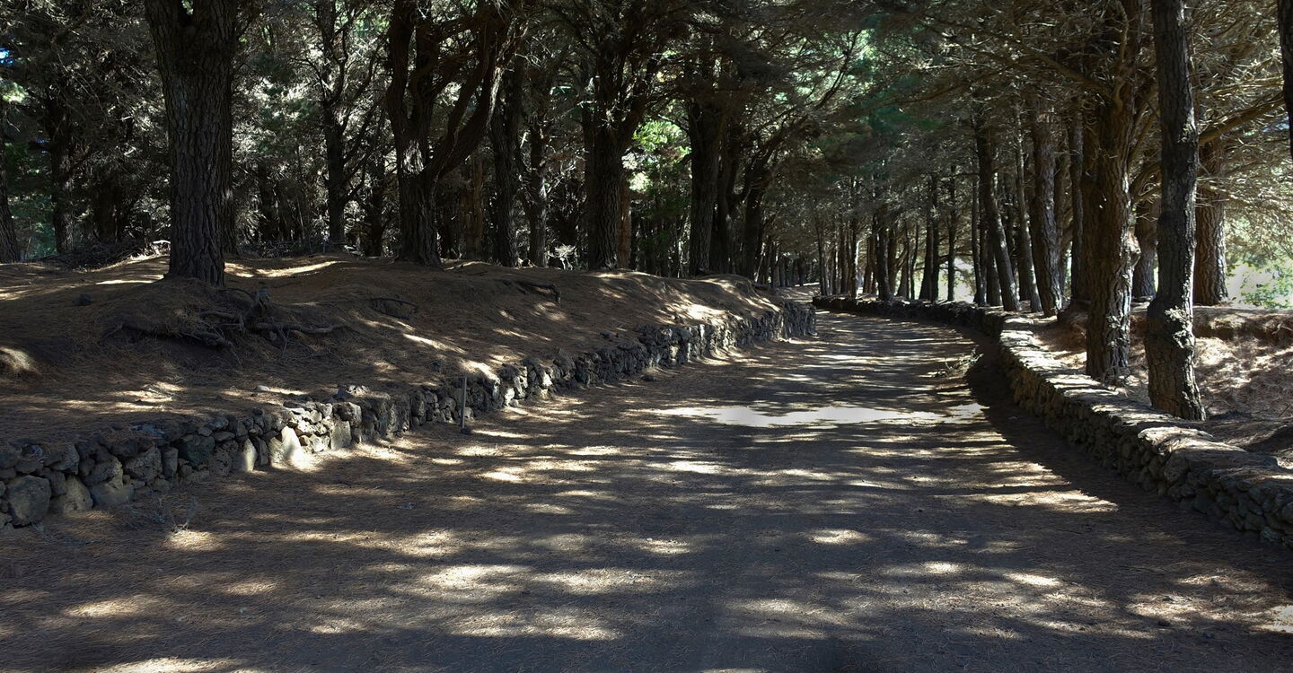 Vom (01) Start und Ziel (985 m) verlassen wir die von San Andres kommende Straße nach halb rechts. Auf der Kiefernallee erreichen wir eine Dreiwegegabelung, an der wir geradeaus weiterwandern. Wir kommen durch einen kleinen Wald, bis dann auf Höhe des rechts von uns liegenden verlassenen Bergdorfes La Albarrada der weitere Weg halb links steil bergauf führt. Nachdem die Asphaltstraße in eine Piste übergegangen ist, erreichen wir eine Anhöhe. Bei guter Sicht erheben sich die Nachbarinseln La Gomera und Teneriffa aus dem Dunst.