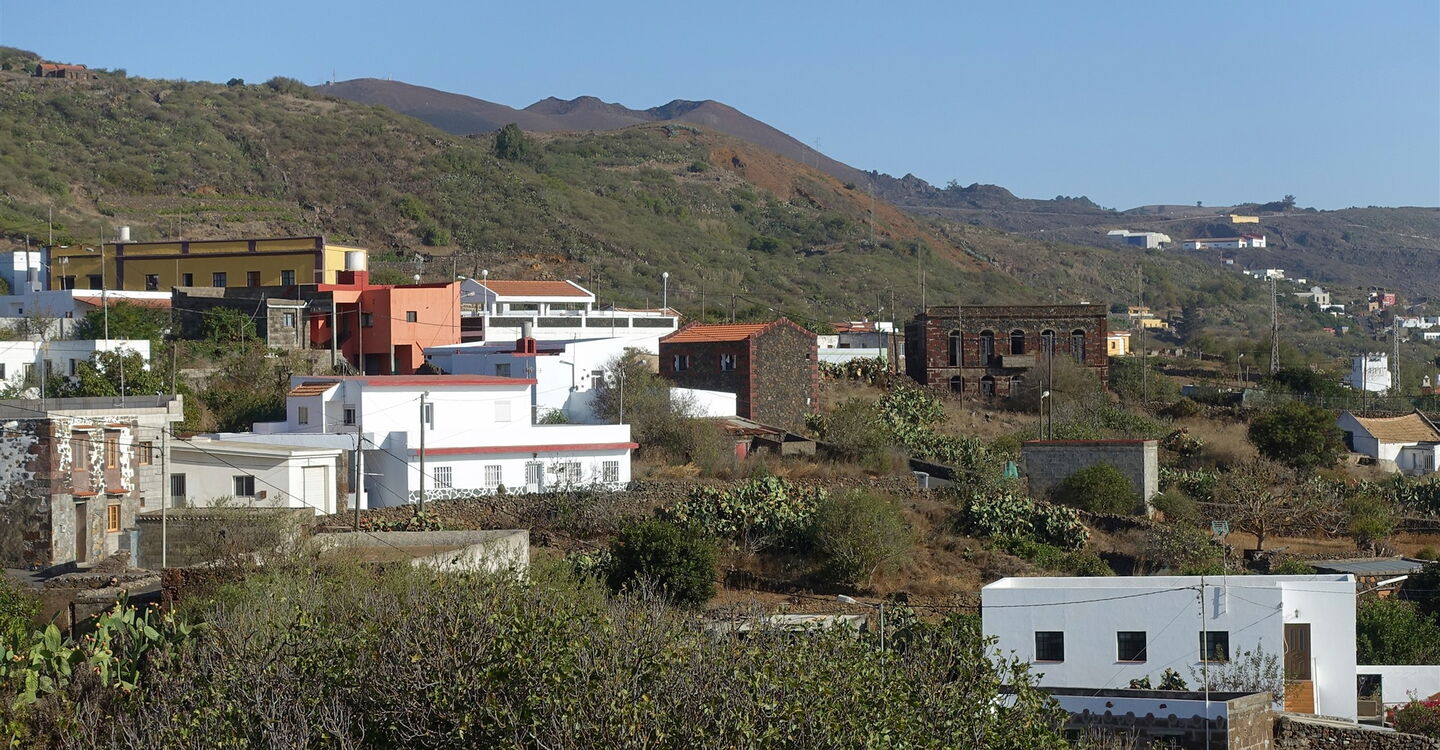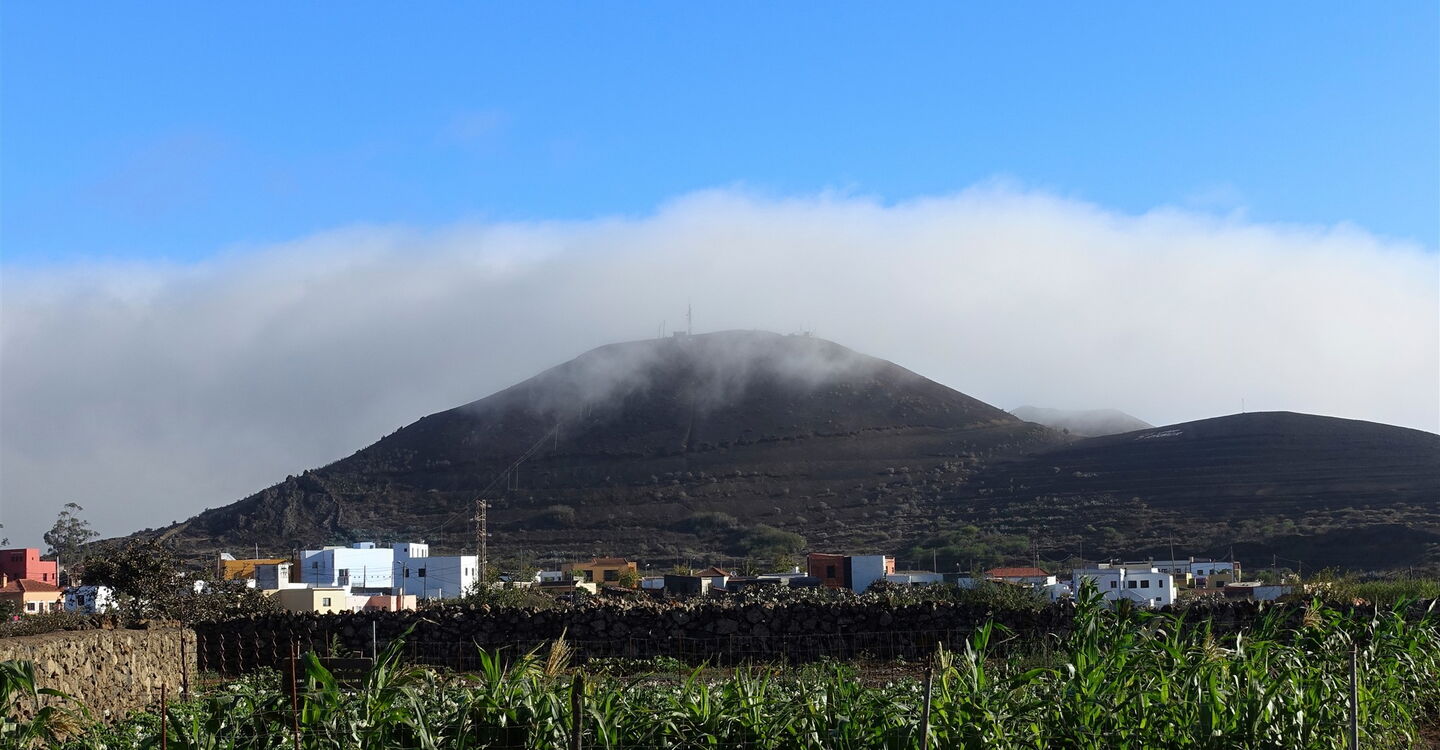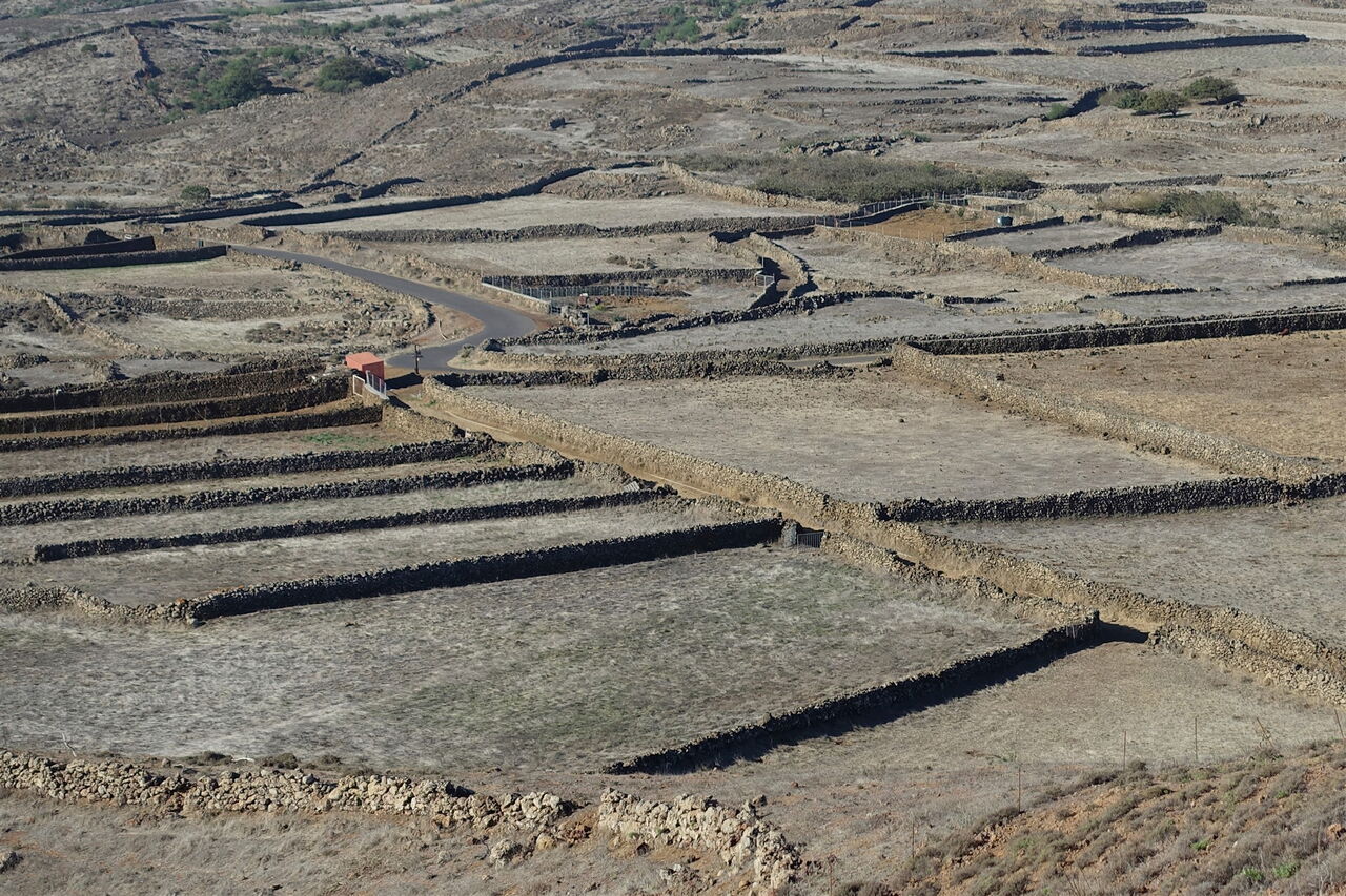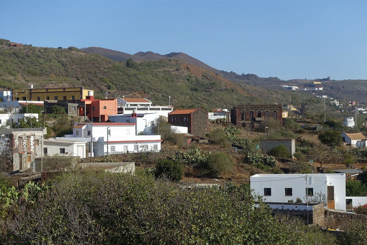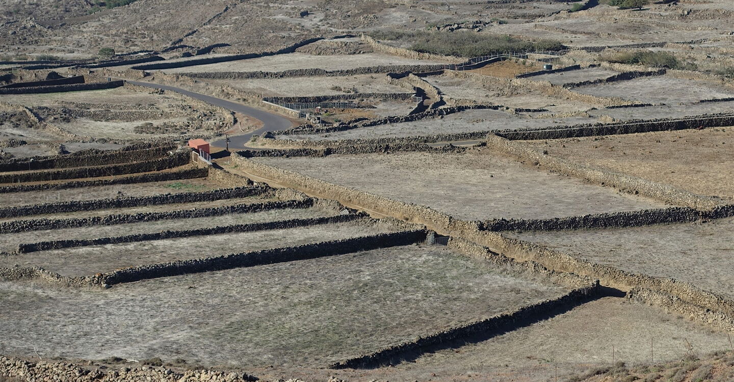 Nach 185 m gibt es die Möglichkeit, nach links weglos auf den Vulkankegel der (02) Montana de Las Rosas (1122 m) aufzusteigen. Nirgendwo auf El Hierro ist das Landschaftsbild derart geprägt von Feldern, die durch Trockensteinmauern begrenzt sind. Vom Gipfel hat man einen hervorragenden Blick über die Felder auf der Hochebene. Wieder zurück auf dem Hauptweg mündet dieser bei einem Wasserverteilerhaus in eine Asphaltstraße, auf der wir geradeaus weitergehen. Bei einem Betonhaus und einer Palme biegen wir nicht rechts auf die Asphaltstraße, sondern gehen geradeaus weiter. Hinter der nachfolgenden Anhöhe sieht man bereits unterhalb das Dorf Isora. Im Spätsommer stillen köstlich schmeckende Feigen der am Wegesrand stehenden Feigenbäume unseren kleinen Hunger.