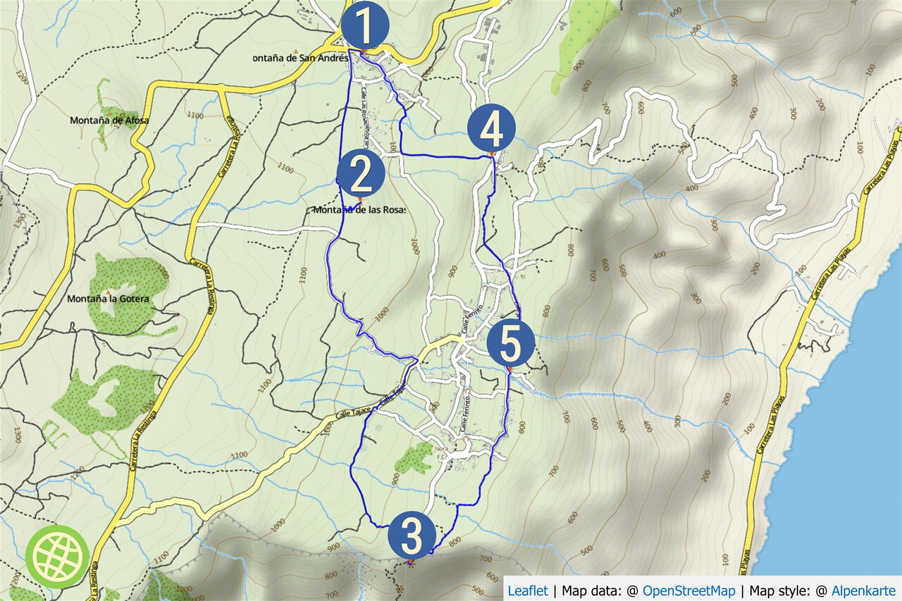 Einfache Wanderung auf Pfaden ohne große Steigungen oder Gefälle. Art des Weges: 20 % Straße, 30 % Piste und 50 % Pfade. Zusatzausrüstung: keine. Einkehr: In San Andres gibt es mehrere Restaurants. Beste Wanderzeit: Frühjahr, Sommer und Winter.
