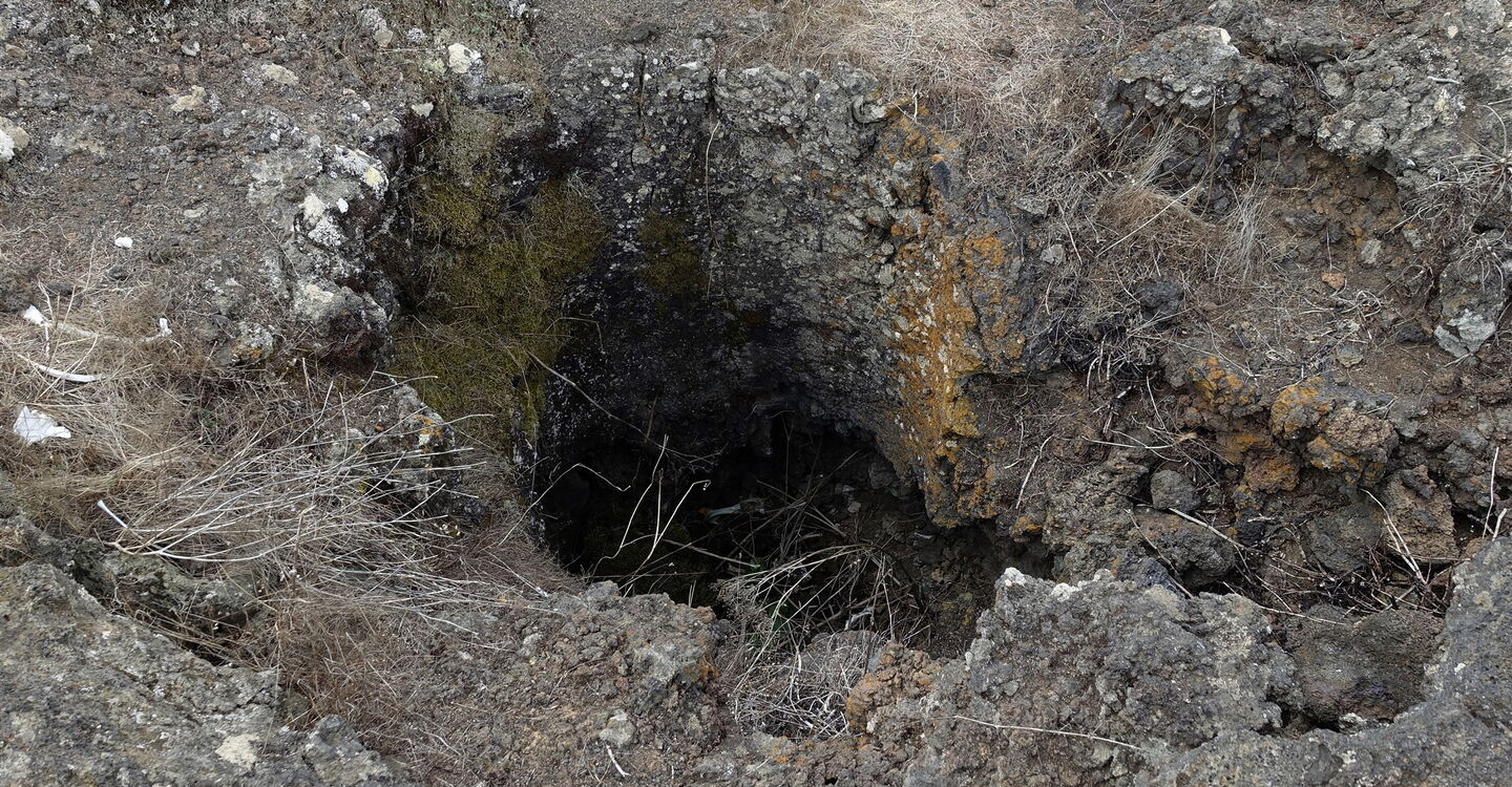 Nach 150 m gehen wir an der Piste links, durch ein Waldstück und bei der folgenden Dreiwegegabelung halb links Richtung San Andres. Nach weiteren 470 m treffen wir auf den Abzweiger, wie er in der Variante beschrieben ist. Die nach weiteren 300 m folgende geologische Sehenswürdigkeit ist nicht einfach zu finden. Vor 2500 Jahren floss Lava um einen Baum und erstarrte, bevor der Baum vollständig verbrannte. Den Baum gibt es schon lange nicht mehr. Was blieb, ist ein 80 cm bis 100 cm großes kreisrundes Loch, beim genaueren Betrachten ist sogar noch der Abdruck der Rinde zu erkennen. Diese sogenannten (05) Vulkanbäume (1050 m) liegen 3-4 m und 10-15 m neben der Piste. Wir setzen unseren Weg auf der weiterführenden Piste fort und nehmen von dort an dieselbe Strecke wie auf dem Hinweg.
