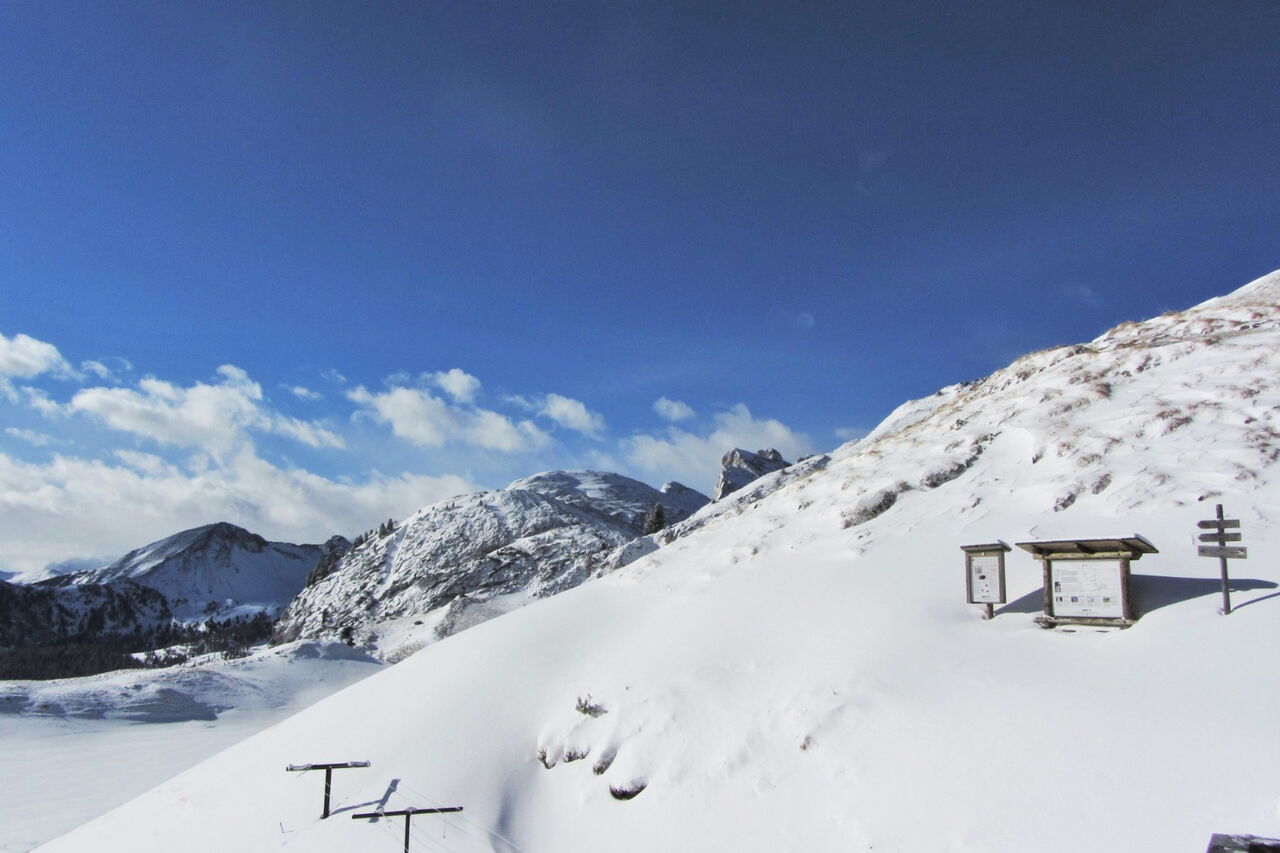 Vor dem Rifugio stehend, gehst du rechts um das Gebäude herum, um dann mit Fellen 1 km und 200 hm bis auf den in westlicher Richtung liegenden Piz Ciampei zu steigen.