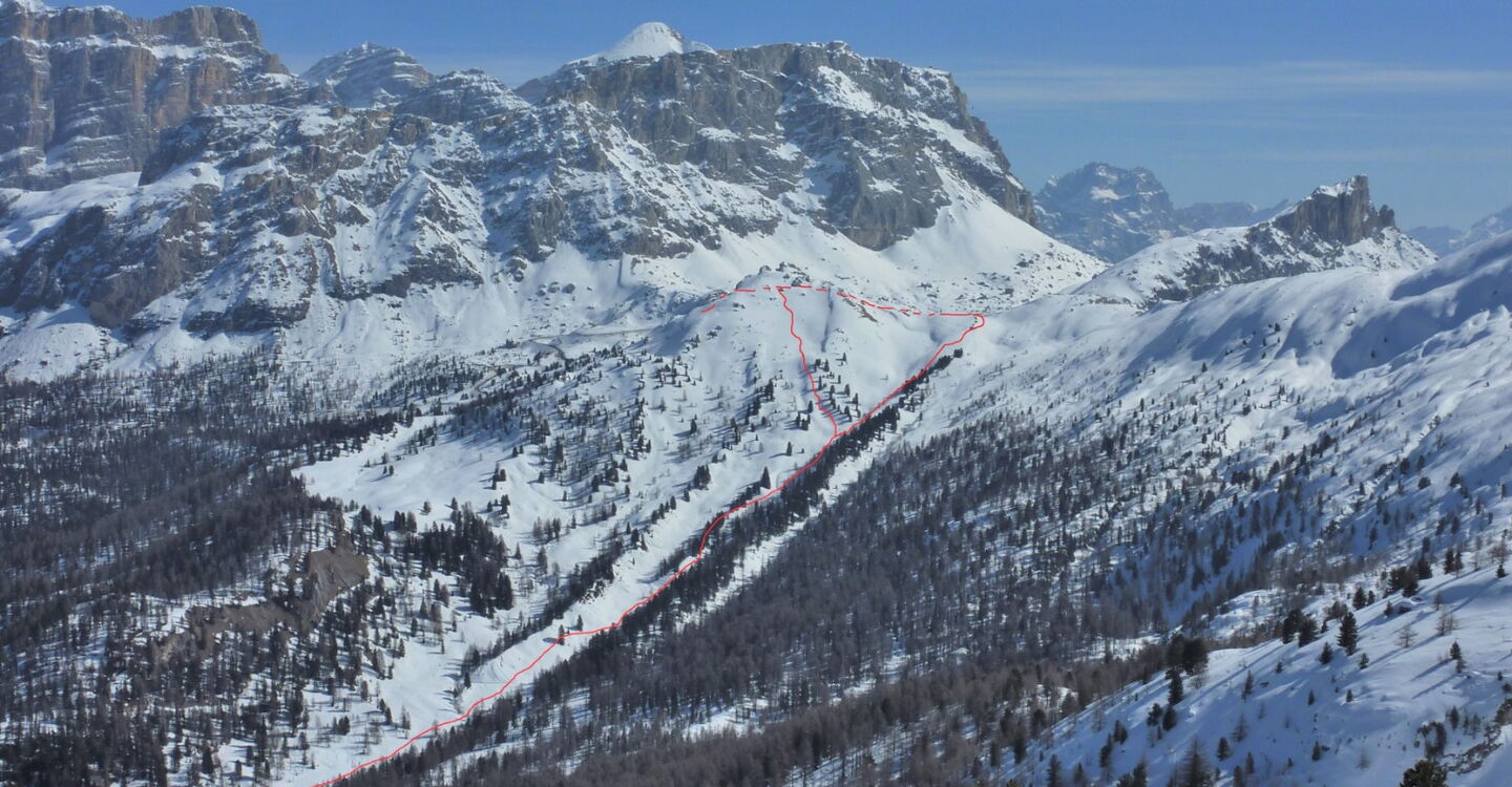 Je nach Schneebedingungen kann man mehrere Varianten nehmen, bis man automatisch in die weiße Rinne der Pra de Ciamena kommt, die bis in den Talgrund führt.