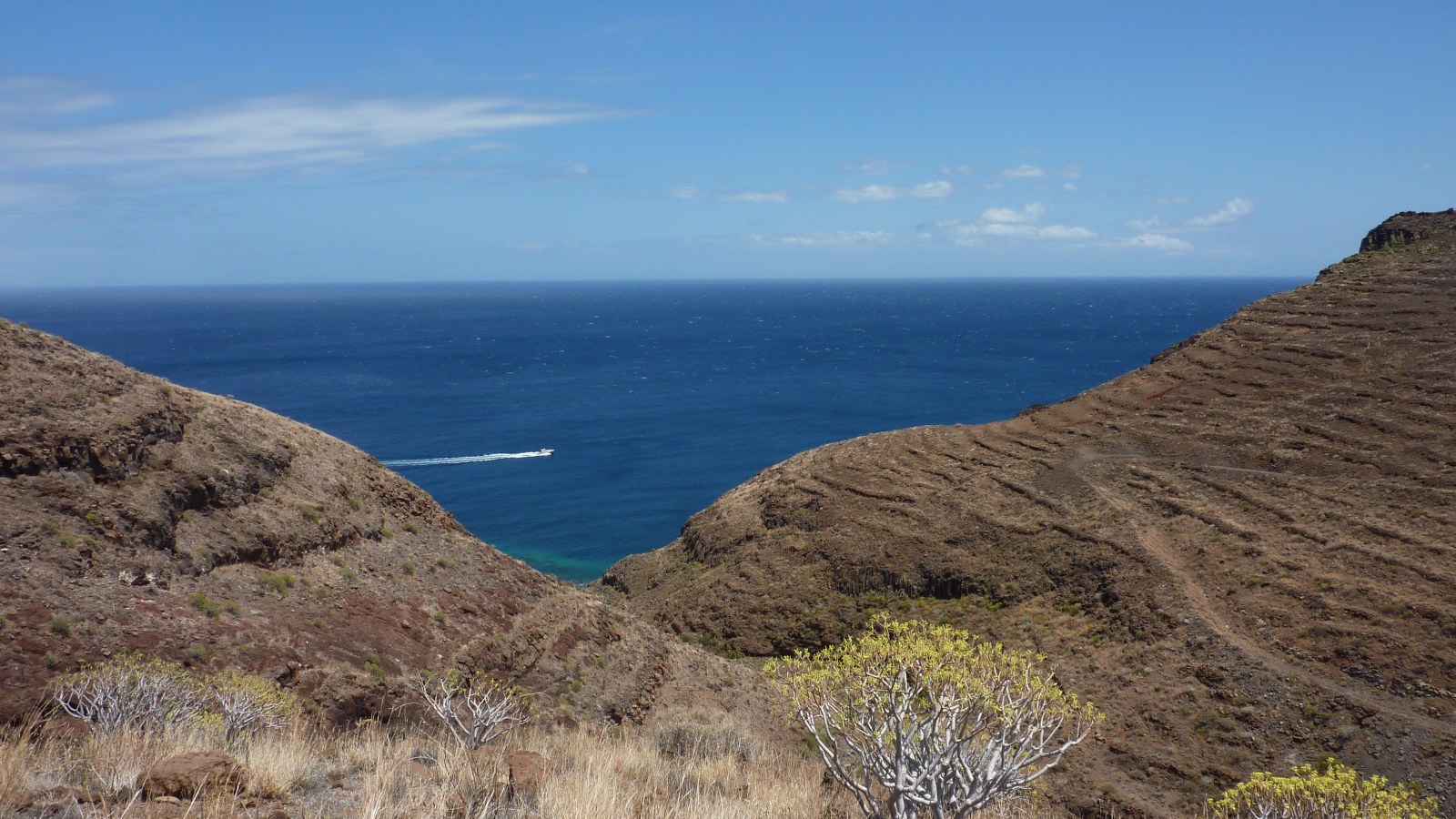 Schaut über den (04) Atlantischen Ozean (164 m), so besteht kein Zweifel, dass wir uns auf einer Insel befinden. Nur bei sehr guter Sicht lässt sich in der Ferne Gran Canaria ausmachen. Wolfsmilchgewächse sind an einer der trockensten Stellen der Insel landschaftsprägend. Vereinzelt lassen sich noch Terrassenfelder aus vergangenen Tagen ausmachen. Schon bald öffnet sich der Blick auf den vor uns liegenden Playa Guancha, in den das mächtige Barranco Guancha mündet. Möchte man noch weiter zum Playa del Caprito wandern, so gilt es, den Risco de la Amargua am Talende zu übersteigen.