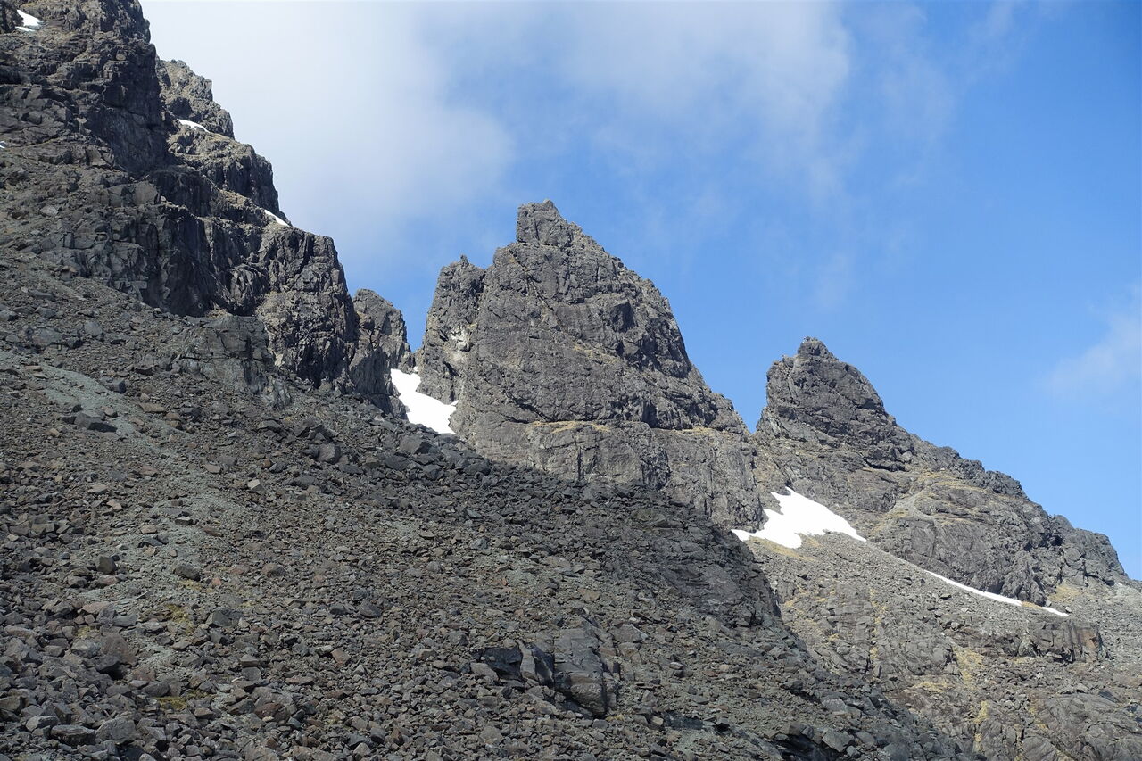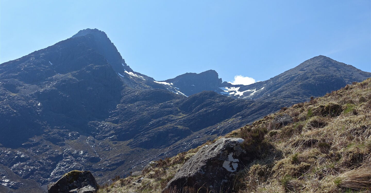 Das faszinierende und weltberühmte Bergmassiv der Schwarzen Cuillins auf der Isle of Skye wird durch die im Halbkreis angeordneten Magmasäulen mehrerer Vulkankrater gebildet. Sie bestehen größtenteils aus Basalt und schwarzem Gabbro – daher die Herleitung des Namens: Black Cuillins. Alle zwölf Munros auf Skye sind Black-Cuillin-Gipfel, mit Ausnahme des Gipfels Blabheinn – siehe Wanderung 23 –, der vom Hauptkamm getrennt steht. Der höchste und unerreichbare Gipfel ist der Sgùrr Alasdair mit stolzen 992 m Höhe, der pyramidenartige Gipfel des Sgùrr nan Gillean ist der schönste Gipfel. Die wichtigste Voraussetzung für eine erfolgreiche Besteigung ist gutes Wetter, denn sonst fehlt die Orientierung in der Steinwüste. Auch nicht zu vernachlässigen ist der finale Aufstieg zum Gipfelplateau mit dem Schwierigkeitsgrad II. Möchte man über die Pinnacle Ridge aufsteigen oder den Gipfel überschreiten und auf seiner anderen Seite absteigen, so begibt man sich in den Schwierigkeitsbereich des technischen Bergsteigens!