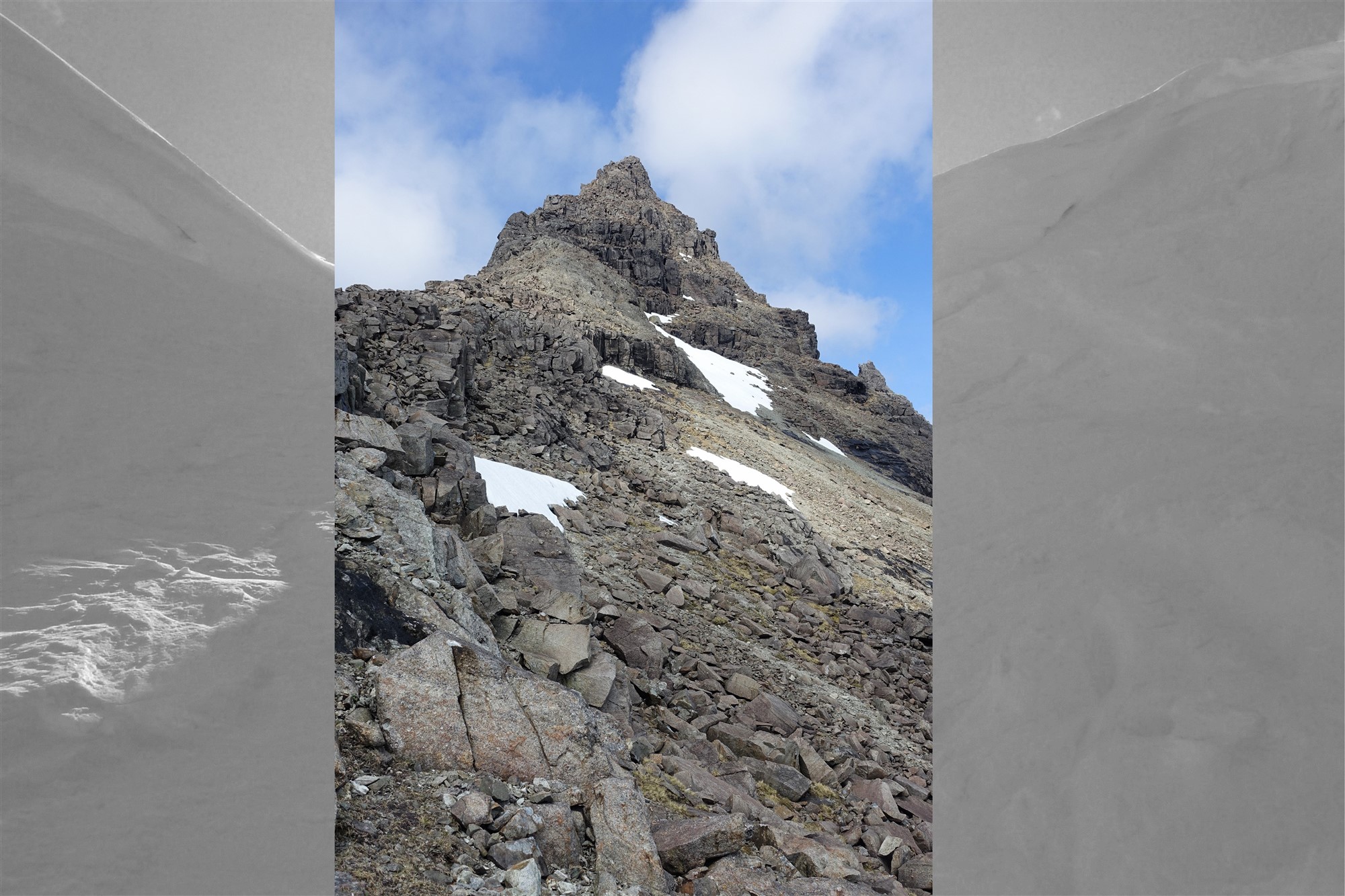 Bei stets eindeutiger Streckenführung erreichen wir nach 3,2 km einen Steinhaufen, dieser markiert einen rechten Abzweiger zu dem sogenannten 03 Pinnacle Ridge (286 m). Bei dieser Variante erfolgt der Aufstieg über felsige Bergspitzen auf einem Bergrücken, der bis zum Gipfel ansteigt. Wir ignorieren diesen Abzweiger jedoch und gehen stattdessen geradeaus weiter. Es folgt noch einmal ein kurzer Abstieg, im gegenüberliegenden Hang sehen wir bereits den Pfad, wie er sich in kleinen Kehren zu einer Anhöhe hochschraubt. Danach wird es immer schwieriger, einen Pfad auf dem felsigen schwarzen Untergrund auszumachen. Wir gehen direkt auf eine Felswand zu: Hinter dieser befindet sich der Südostgrat, den wir schließlich zum finalen Aufstieg bis zum Gipfel nutzen.