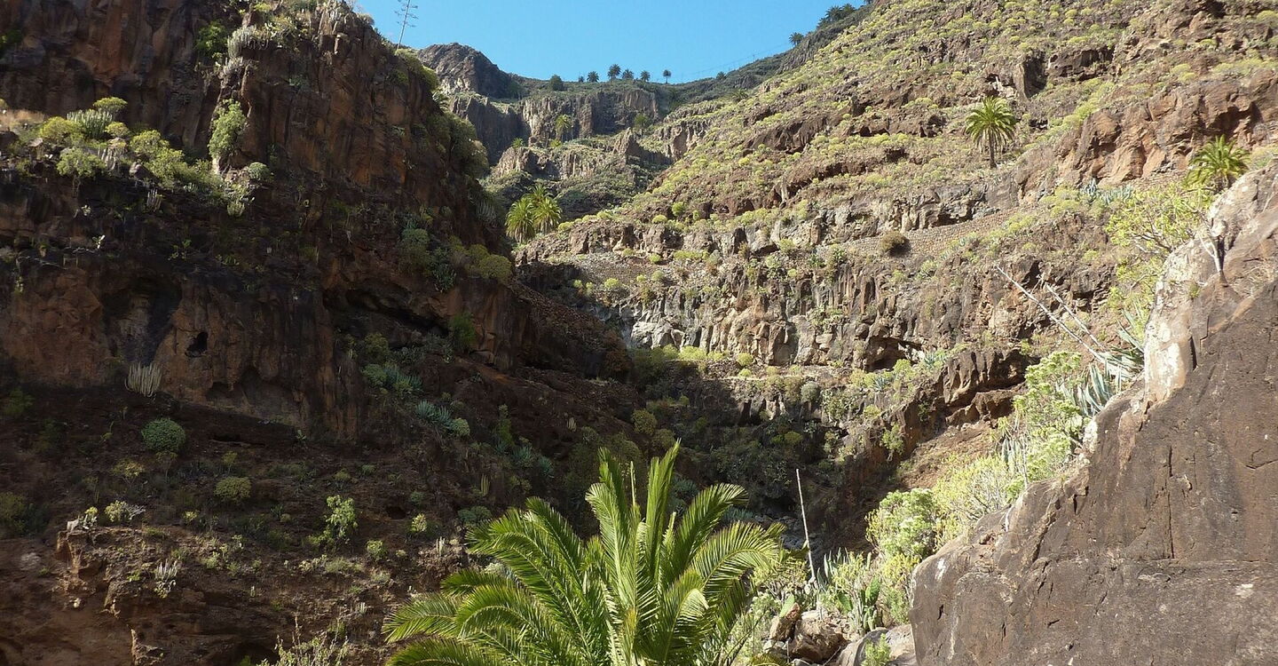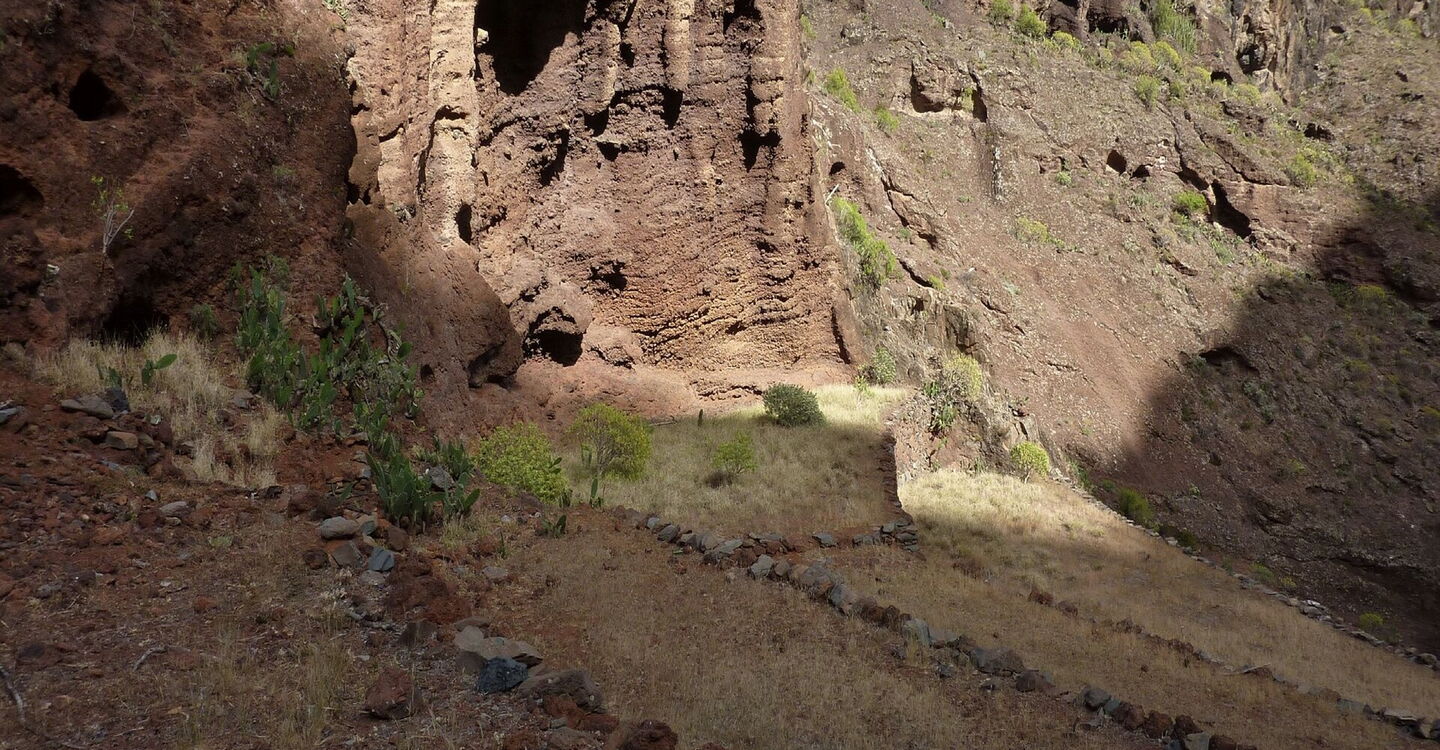 Im sonnigen Süden von La Gomera, westlich vom Flughafen, befindet sich versteckt und unentdeckt das beeindruckende Barranco Erese, das an seinem Schluchtauslauf einen wunderschönen Strand geformt hat. Selbst nach einem trockenen Sommer versiegte das Quellwasser nicht. Diese Besonderheit der Natur hatten sich Bauern zunutze gemacht und im oberen Teil der Schlucht in beeindruckender Lage Terrassenfelder angelegt. Heutzutage ist die gesamte Besiedlung verlassen und dem Verfall preisgegeben. Es folgt eine spektakuläre Wanderung im Barranco, bis wir auf einen alten Verbindungsweg durch die Schlucht treffen. Hier kann man links bergauf den schwierigen Abstieg wählen oder rechts bergauf eine gemütliche Variante.