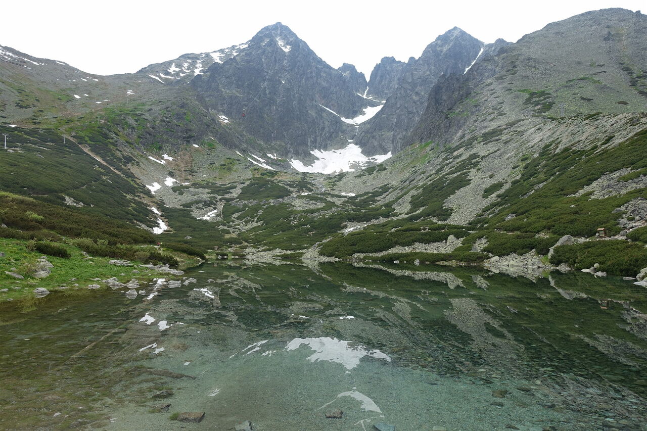 Über den Berggrat steigen wir bis zur Einsattelung ab, im Tal sieht man bereits die Chata pri Zelenom plese, direkt neben dem gleichnamigen See gelegen. Vor uns liegt ein steiler und gerölliger Abstieg. Ein Bachbett wird gequert, Sicherungsketten leiten den Wanderer durch eine rutschige Rinne. Ein weiteres Mal wird das Bachbett gequert und wir laufen nun taleinwärts bis zur 03 Chata pri Zelenom plese (1548 m).