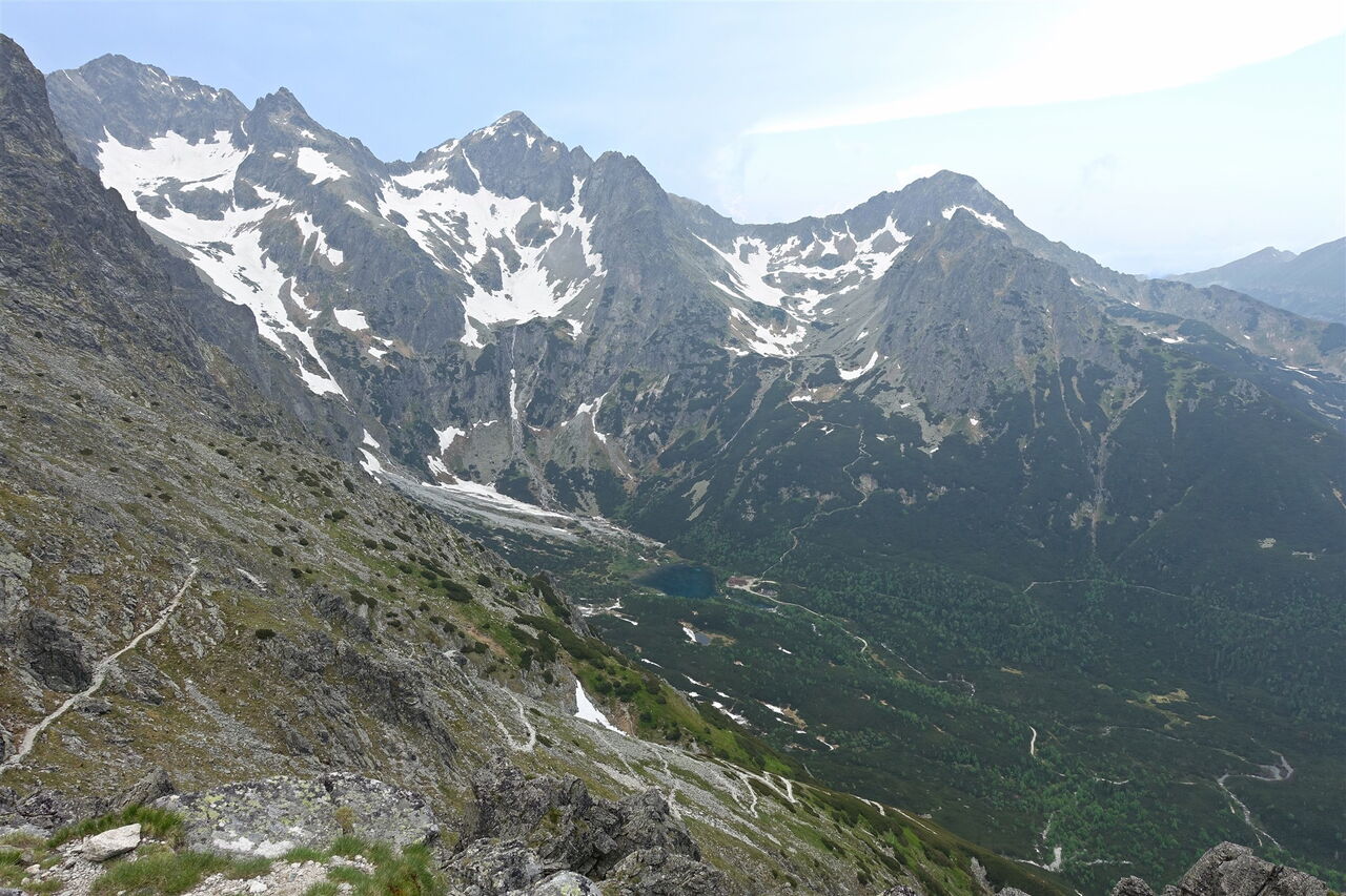 Hinter dem Gebäude der Seilbahn, die auf den Lomnický štít führt, befindet sich der See 01 Skalnaté pleso (1754 m). Dort beginnt ein Pfad entlang von Schienen, die zum Observatorium führen. Nach kurzem Aufstieg erreichen wir das Verbotsschild, das das Weitergehen in den Wintermonaten verbietet. Wir steigen entlang einer oberirdisch verlegten Stromleitung auf, um dann in einem Rechtsbogen durch Latschenkiefern zu wandern. Im Hintergrund erhebt sich die Belaer Tatra mit ihren prächtigen Wänden aus Dolomitgestein sowie den sattgrünen und steilen Grashängen.