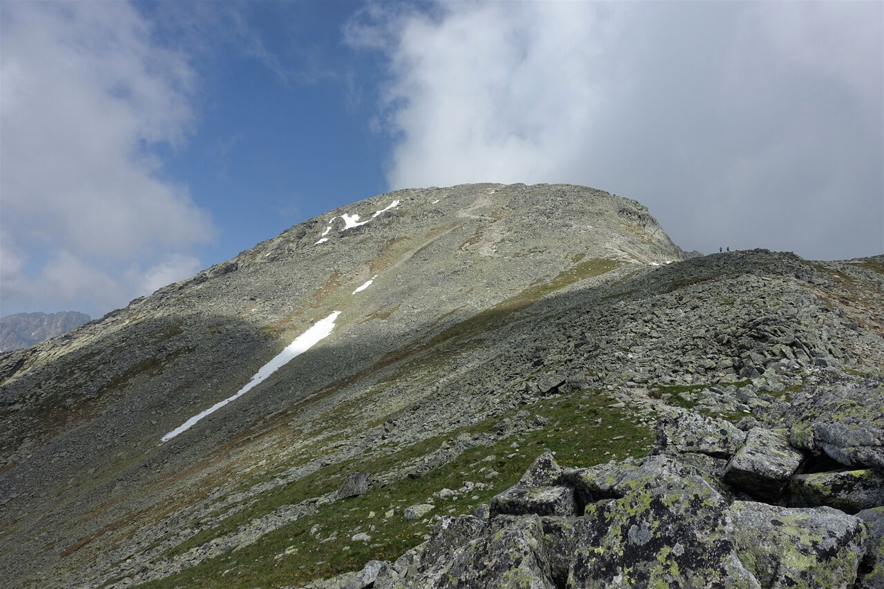 In Serpentinen durch Latschenkiefern erreichen wir einen Berggrat, der sich nun kontinuierlich in Richtung des Vorgipfels 04 Slavkovský nos (2273 m) schlängelt. Weiterhin bietet sich ein faszinierender Blick auf die Bergwelt nördlich von uns. Glück dem, der schönes Wetter hat!