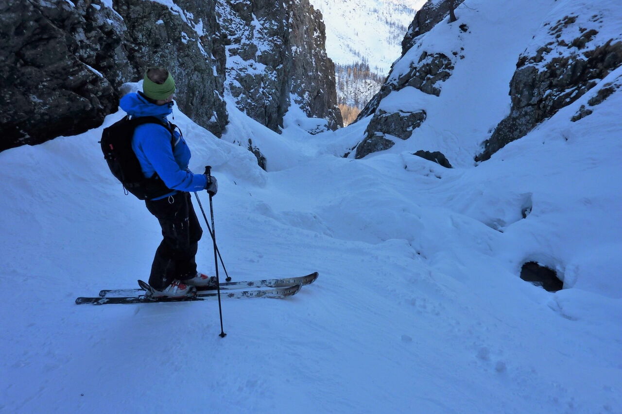 Der Einstieg in die Scharte und auch in den Canyon erfordert eine gute Orientierung, am besten mithilfe des GPS-Tracks. Die Abfahrt führt über einen Westhang. Folgende Ausrüstung wird empfohlen: Produkte für alpine Sicherheit im Schnee, Freerideski und Skitourenhelm. Es gibt verschiedene Restaurants zur Einkehr im Skigebiet. Beste Jahreszeit: Januar bis April. Uns erwarten kurze Stücke mit bis zu 40° Hangneigung.