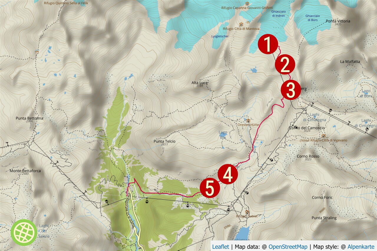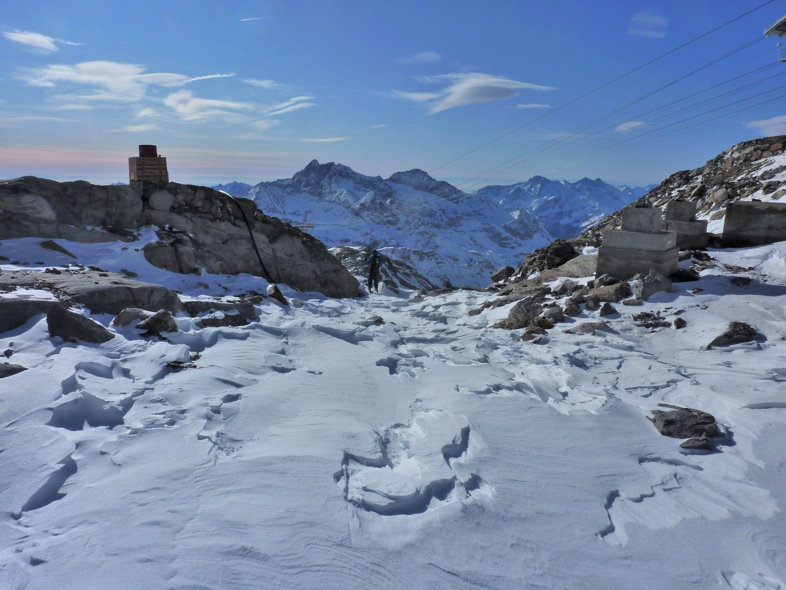 Bei der Bergstation der Seilbahn Nr. 26 Passo dei Salati Indren fahren wir gleich rechts, aber nicht unter der Seilbahn hindurch. Nach 600 m umfahren wir rechts einen gefrorenen Gletschersee.