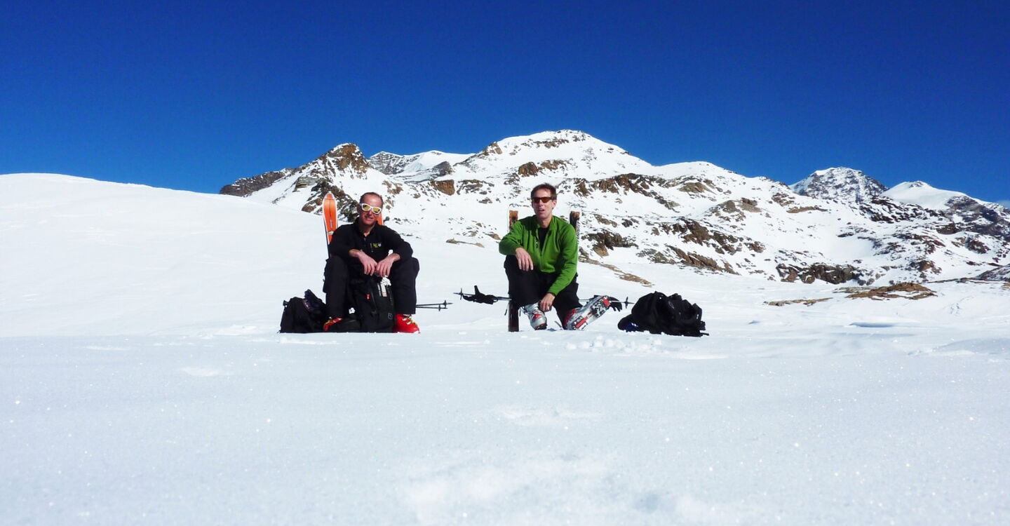 Nach einer Pause am Pass mit grandiosem Ausblick auf die umliegende Bergwelt folgt eine rasante Abfahrt auf weiten und unberührten Hängen, bis wir eine Endmoräne rechts liegen lassen.