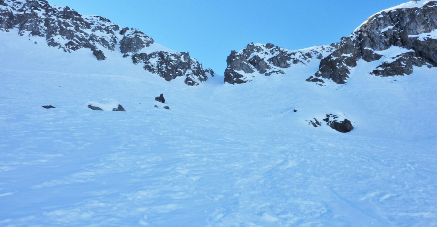 Je nach Schneeverhältnissen sehen wir einen Felsen, an dem wir links vorbeifahren, um nach 900 m hinter dem Lift zur Einfahrt in die Scharte zu kommen. Die Scharte ist 10 bis 15 m breit.