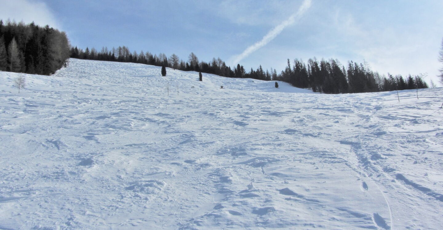 Hier beginnt eine rasante Abfahrt. Nach etwa 1 km kommen wir auf die Forststraße und folgen dieser. Wir passieren die Nußbaumlahner Alm, und nach 200 m fahren wir links über die Stegerwiese weiter.
