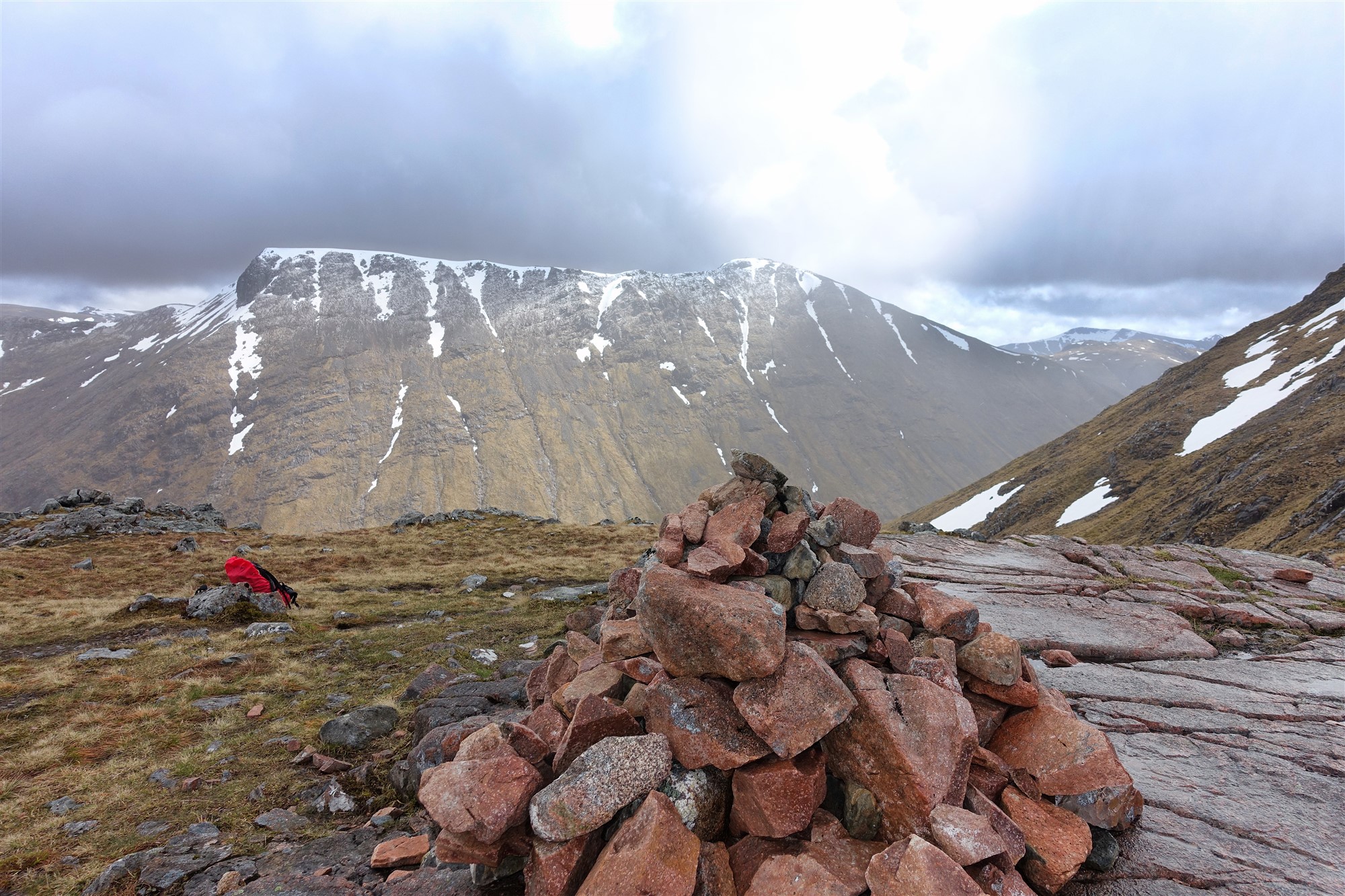 Auf dem grasigen Untergrund ist der Pfad kaum auszumachen, die Orientierung bleibt aber einfach, da wir mittig auf dem Bergrücken steil aufsteigen. Auch auf dem nachfolgenden Schotterfeld erfolgt der Aufstieg weglos, einige Steinmännchen sind nicht hilfreich. Wir erreichen einen ersten Vorgipfel, der durch einen Steinhaufen markiert ist, beim zweiten Steinhaufen haben wir den Gipfel des 03 Stob Dubh (958 m) erreicht. Mindestens 20 weitere Gipfel (Munros) sind in Sichtweite und es folgt eine astreine Gratwanderung.