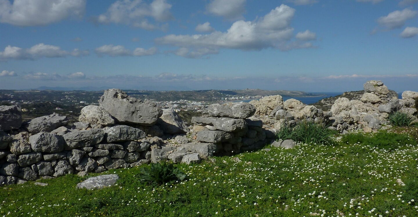 Gemächlich gewinnt der Pfad an Höhe, unterhalb der rechts von uns liegenden mächtigen Felswand. 330 m hinter dem Ziegengatter führt rechts bergauf ein Pfad zu einer großen offenen (03) Höhle (112 m) und Kletterstelle. Beim Anstieg wird etwas Kletterfertigkeit gefordert, um endgültig den großen Schlund der Höhle zu erreichen. Wir staunen über die atemberaubenden Ausblicke auf das tiefblaue Meer. Anschließend gehen wir zunächst auf dem gleichen Weg zurück, um dann unsere Wanderung auf dem eingeschlagenen Pfad fortzusetzen. Der Pfad ist nun nicht mehr so ausgeprägt, dafür helfen Steinmännchen bei der Orientierung. Die mächtigen Felswände liegen hinter uns und es ergibt sich ein wunderschöner Blick auf den langen Strand von Afandou.