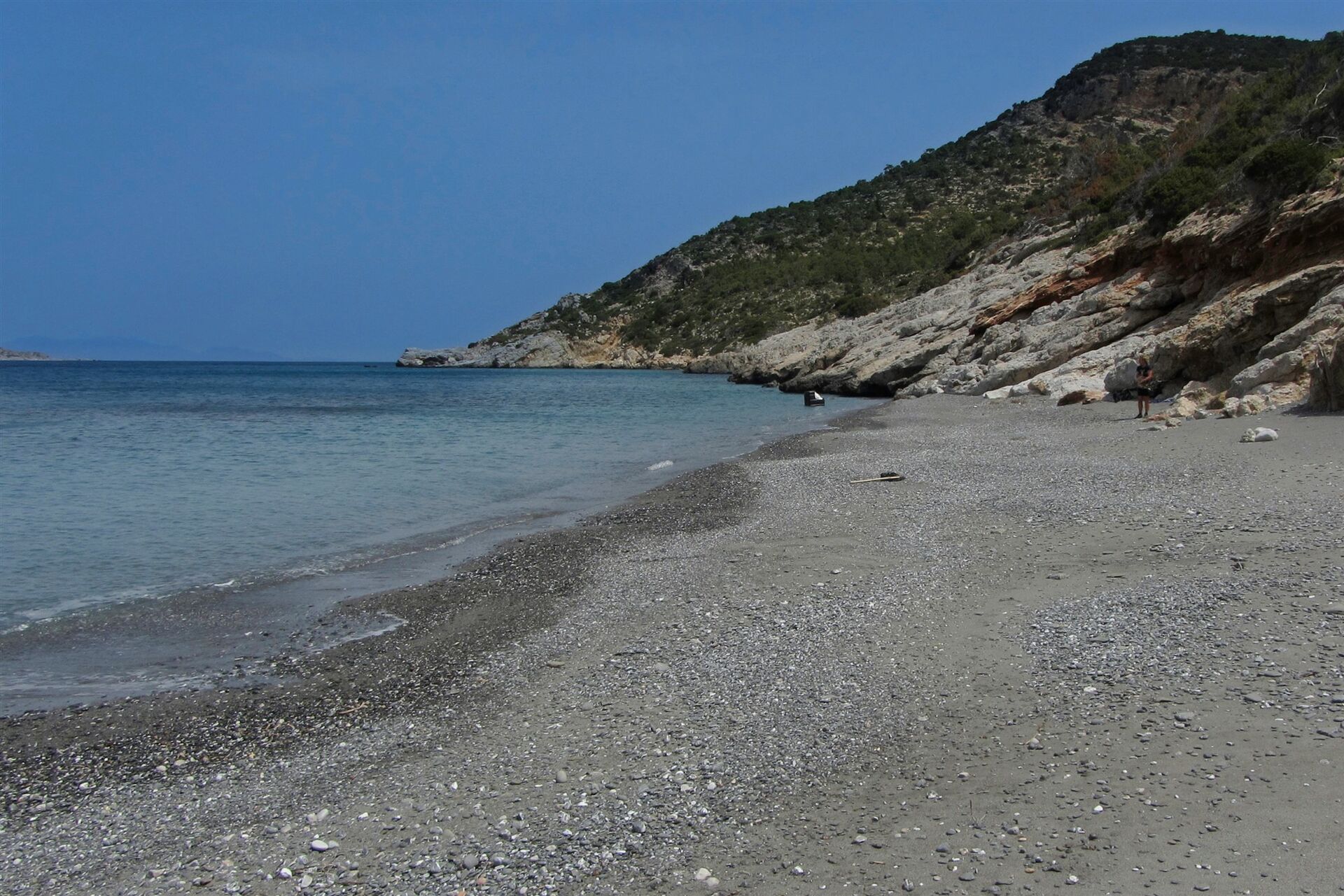 Hier gehen wir rechts, durch die Streusiedlung, bis zu einem alleinstehenden Haus. Hinter diesem führt ein Pfad nur einige Meter halb links bergauf, um dann rechts auf der Schotterpiste weiter zu gehen. Diese endet bereits nach 50 m, wir gehen links herunter auf der anschließenden Schotterpiste bis zum (03) Strand von Paleochora (0 m). Der 100 m lange und 20 m breite Strandabschnitt besteht aus Kieselsteinen mit sandigen Stellen. Das Wasser ist kristallklar man kann bequem baden gehen.