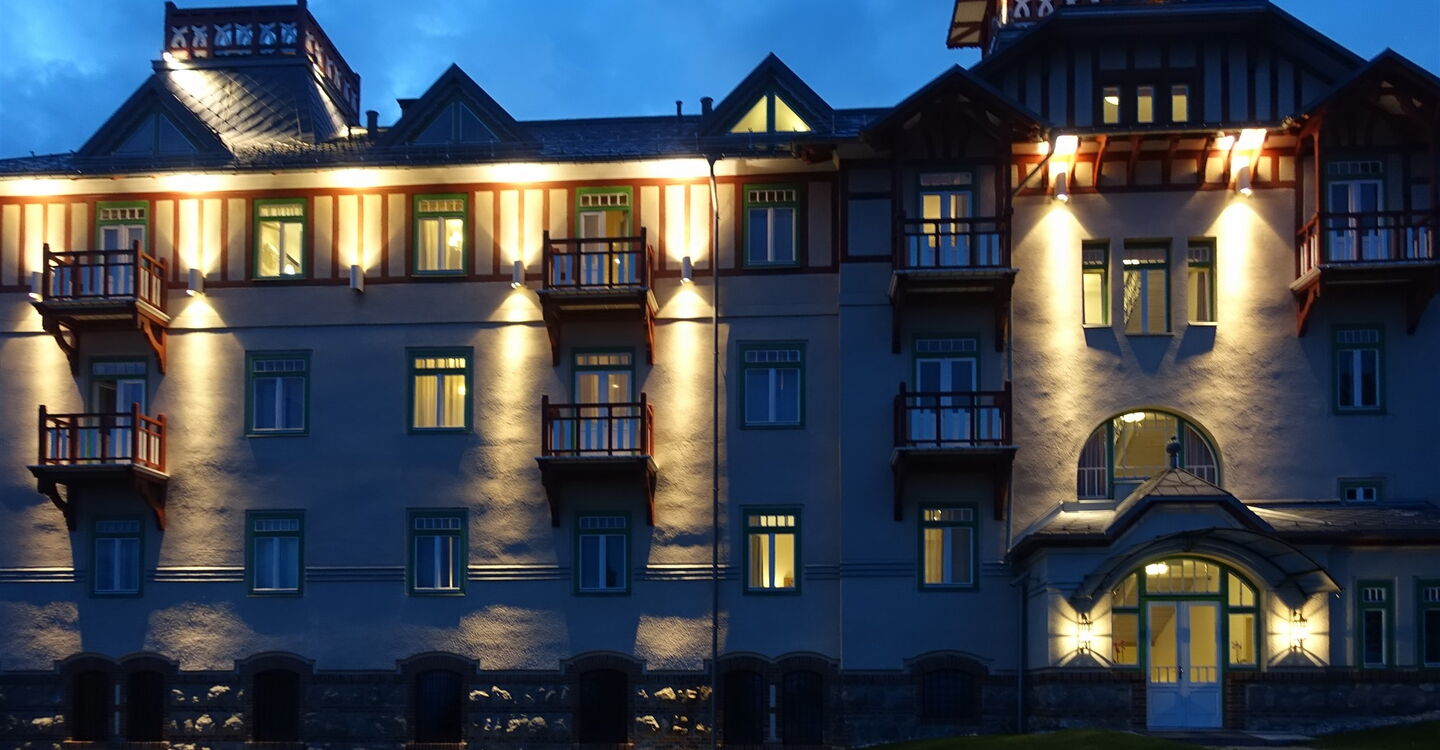 Wir erreichen die Wegekreuzung 05 Škutnastá poľana (1710 m), gehen ein langes Wegstück links bergab und folgen der Ausschilderung Richtung Štrbské Pleso. Zwischenzeitlich kommen wir an einer einzelnen Hütte vorbei. Unser Pfad mündet in einen Karrenweg, dem wir links bergab folgen. Fast auf gleicher Höhe sehen wir die große Sprungschanze. Einen nach links abzweigenden Pfad zum unterhalb liegenden See ignorieren wir und bleiben auf dem breiten Karrenweg. Auf der nachfolgenden Straße gehen wir dann an der Rückseite des Hotels Solisko und des Hotels Kempinski vorbei und erreichen an einer gepflasterten Straße rechteckige Apartmenthäuser. Nach rechts führt ein blau markierter Treppenweg herunter in den Ort und weiter zum Bahnhof.