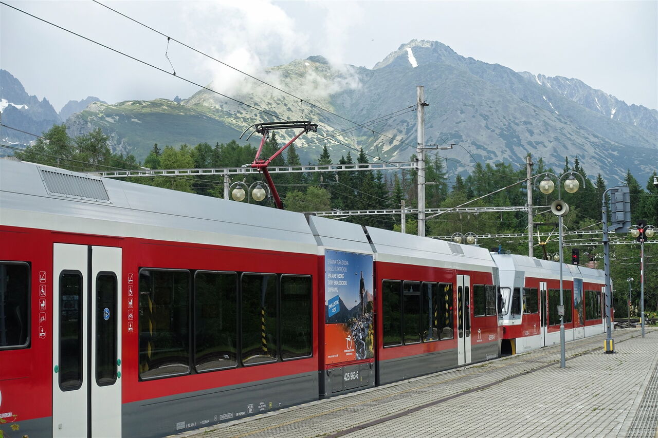 Den Bahnhofsplatz der elektrischen Schmalspurbahn 01 TEŽ Štrbské Pleso (1322 m) verlassen wir in nördliche Richtung und gehen an dem rechts von uns liegenden großen Parkplatz vorbei. Sobald die Straße endet, marschieren wir links und sofort wieder rechts, nun durch die Fußgängerzone des Ortes. Nach kurzem Aufstieg gehen wir an der Straßenkreuzung weiter in nördliche Richtung entlang der Straße, vorbei an einem weiteren Parkplatz und unter einer Fußgängerbrücke hindurch.