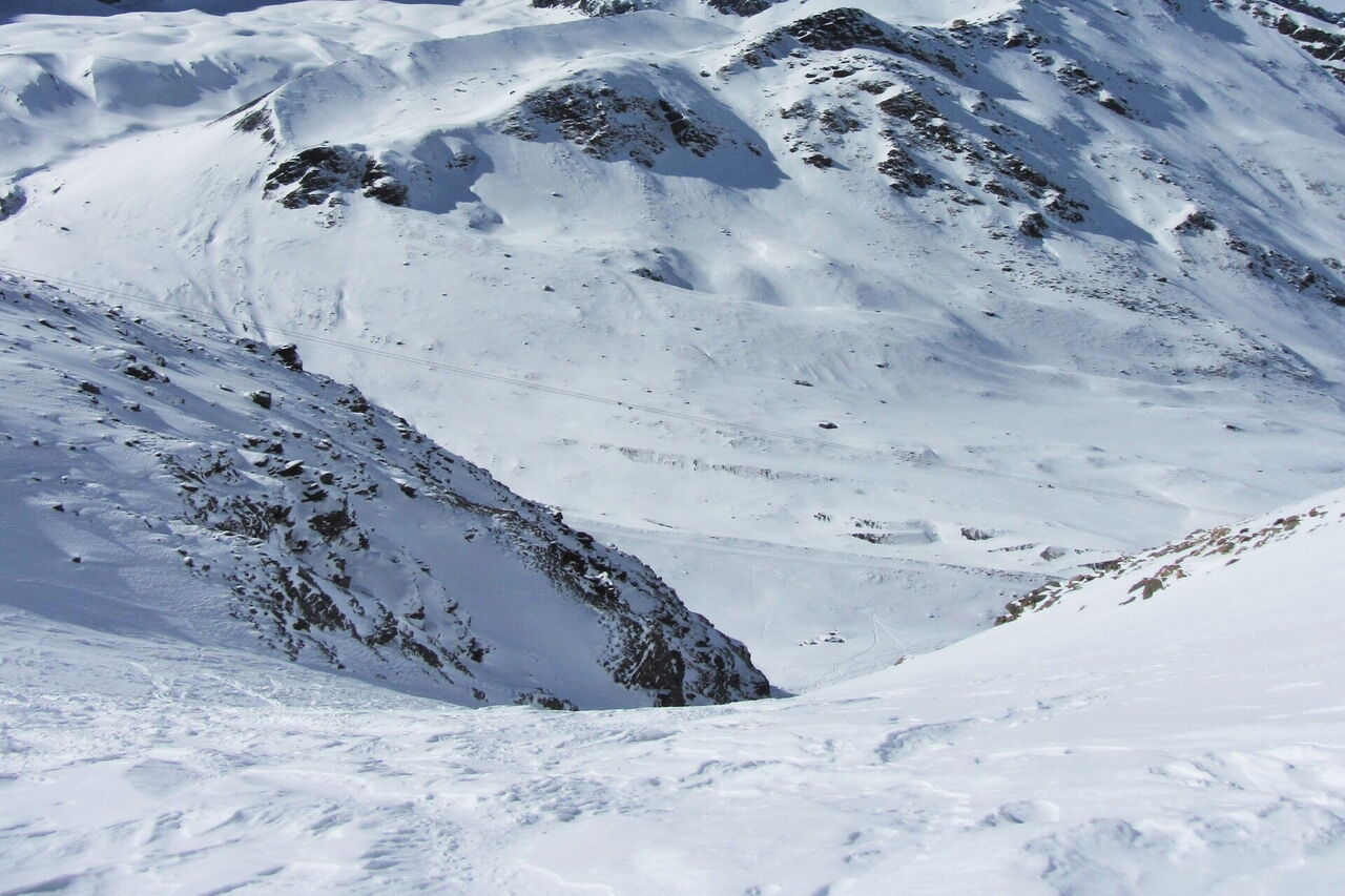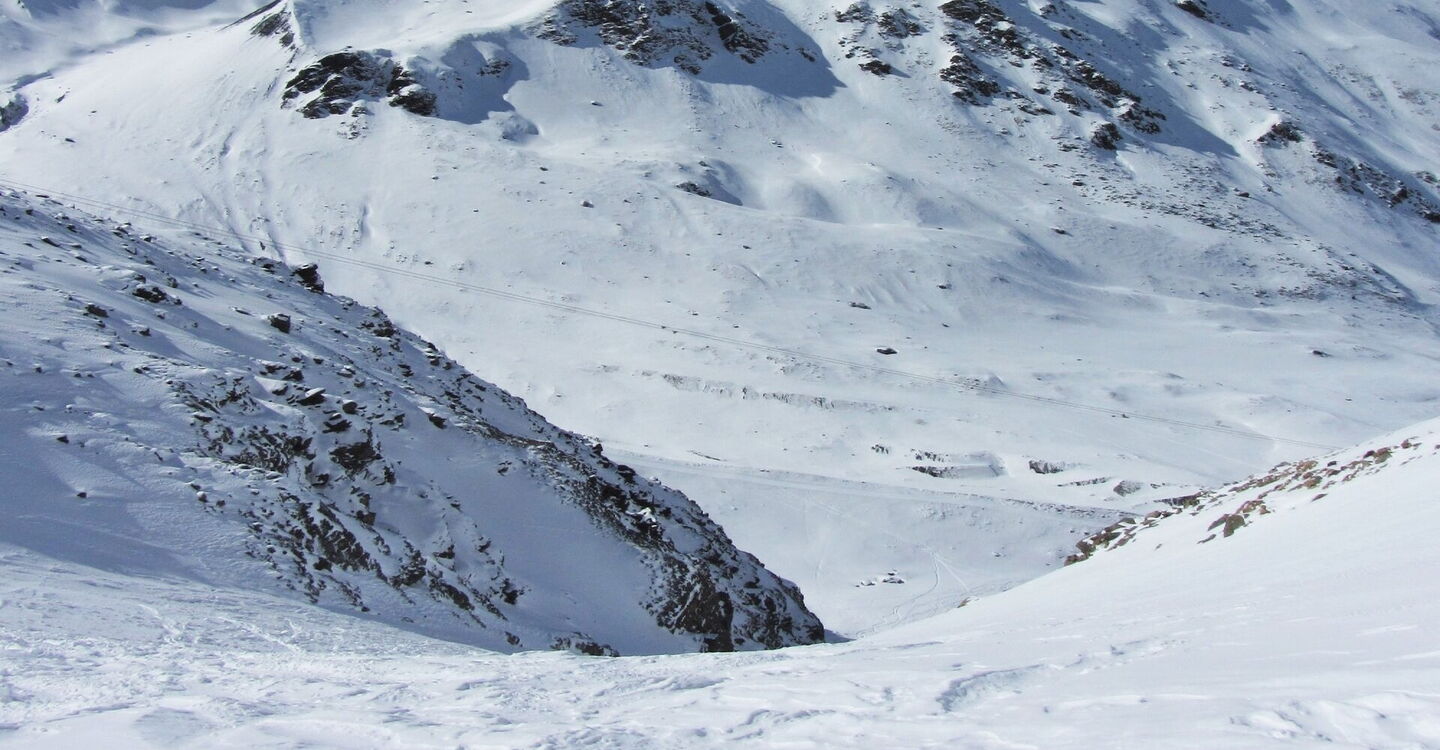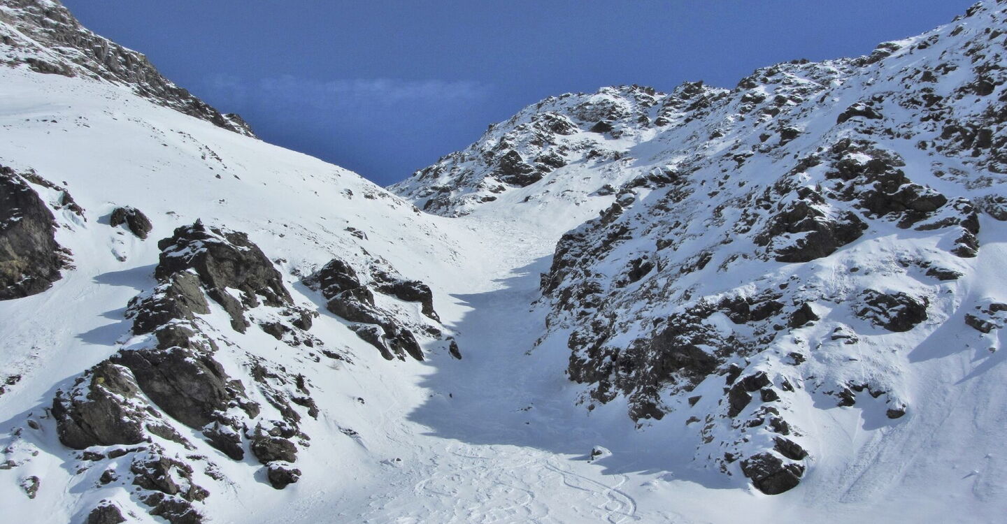 Einfache Orientierung auf dem Freeride-Stück außerhalb der markierten Pisten. Die Abfahrt führt über einen Westhang. Folgende Ausrüstung wird empfohlen: Produkte für alpine Sicherheit im Schnee, Freerideski und Skitourenhelm. Es gibt keine Einkehr auf der Tour. Beste Jahreszeit: Januar bis April. Uns erwarten kurze Stücke mit bis zu 40° Hangneigung.