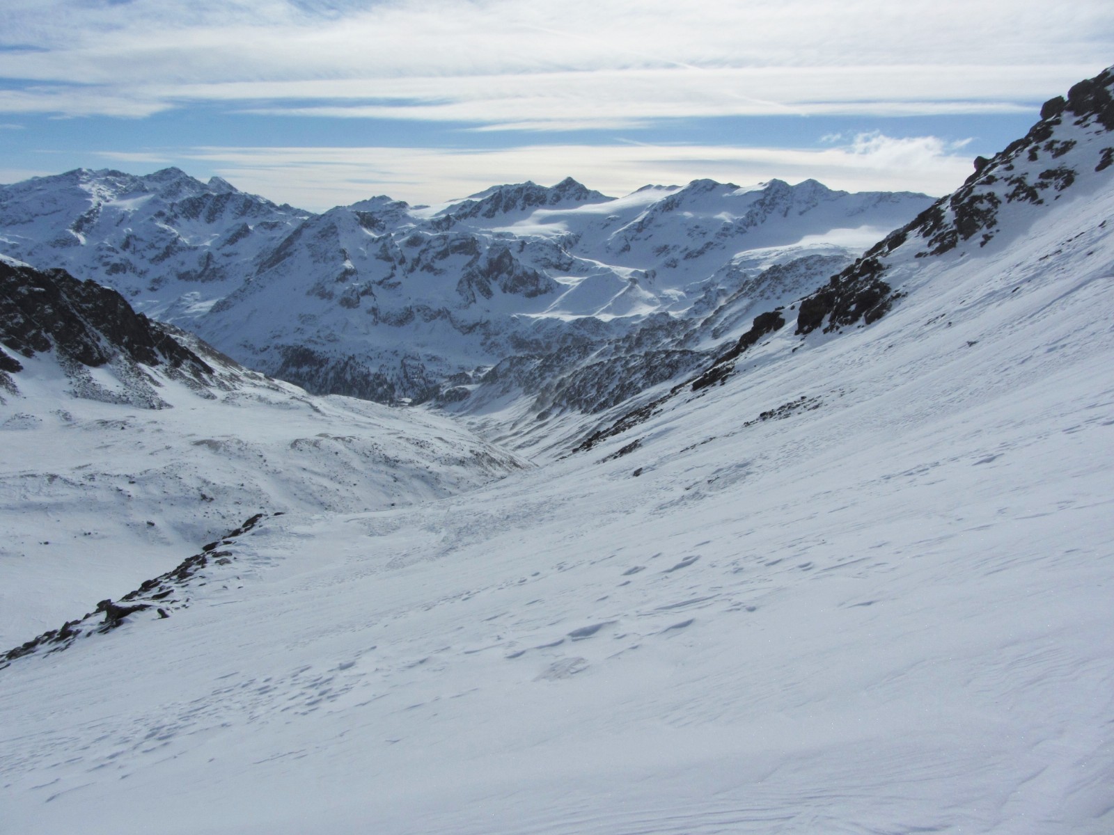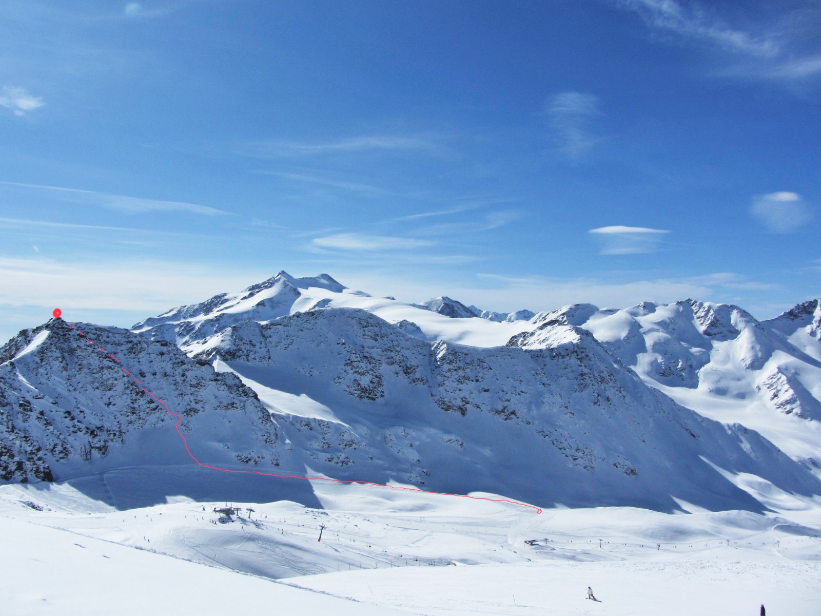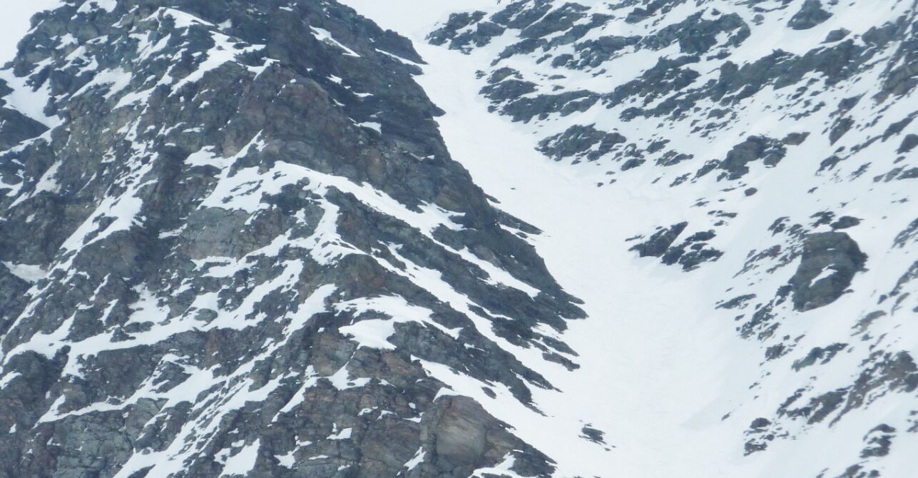 Mein Bergführer Hubert hatte das "Lawinen-Panik-Gesicht". Wir haben die Abfahrt durch die Scharte, wie im Bild gezeigt, nicht gemacht und sind den gleichen Weg zurückgegangen.
