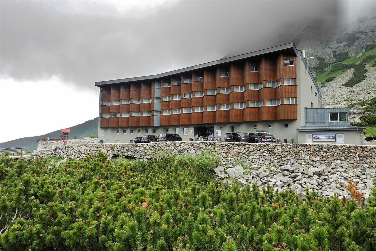 Das ursprüngliche Tal verengt sich und wir kommen oberhalb eines weiteren Sees vorbei. Sattgrüne Wiesen und Felsen mit Gletscherschliff prägen die Landschaft auf dem nachfolgenden Abstieg. Hinter einem großen Wasserfall und einem weiteren See befindet sich auf der rechten Seite der 04 Sliezsky dom (1623 m), die erste Einkehrmöglichkeit. An der Weggabelung orientieren wir uns in südöstlicher Richtung und gehen auf dem grün markierten Pfad weiter bergab Richtung Tatranská Polianka.