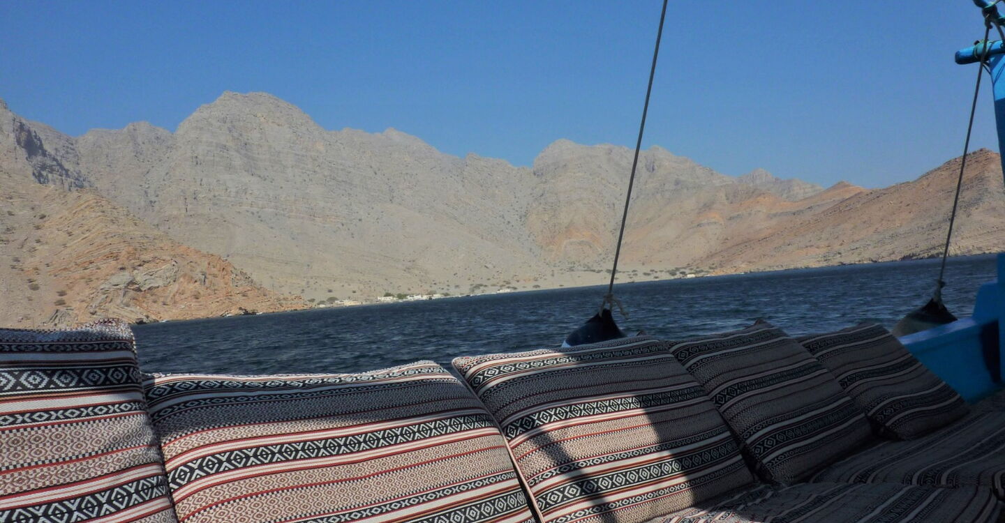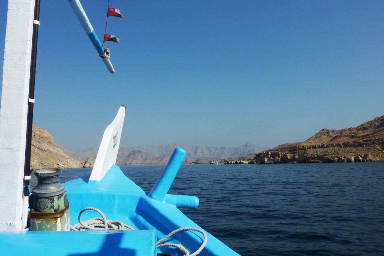 Vom Hafen aus fahren wir erst noch kurz auf der Straße von Hormus. Von hier sind es 65 km zum Iran, bis wir dann in den traumhaft schönen Chaur-asch-Scham-Fjord eintauchen.
