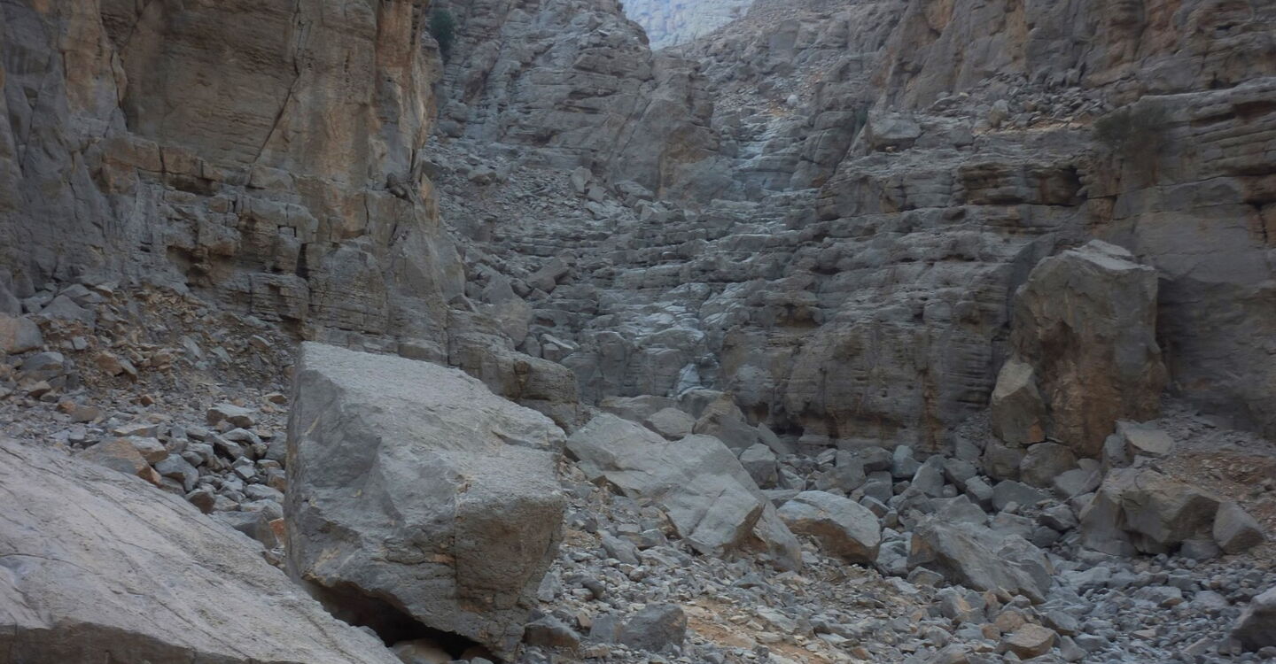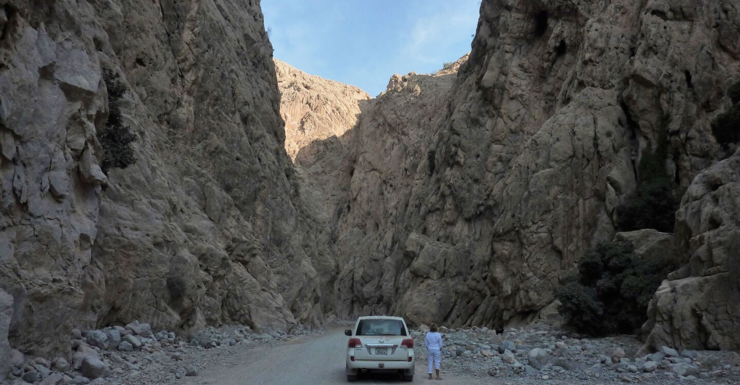 An der engsten Stelle ist das Trockenflussbett, welches in diesem Falle gleichzeitig die Straße ist, nur 5 bis 7 m breit, und die Felswände gehen 300 bis 400 m senkrecht in die Höhe.