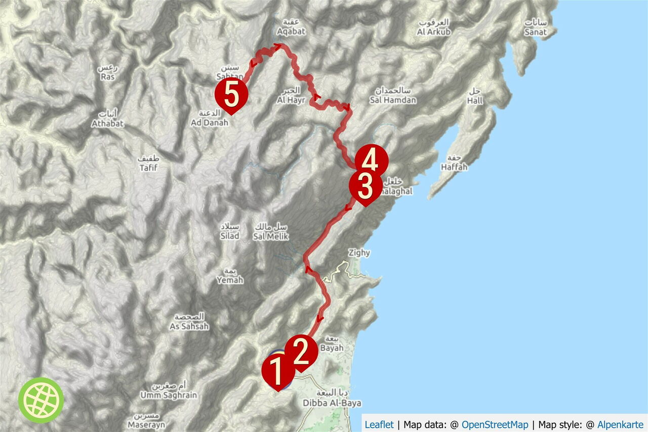 Die Garmin-Navigationsgeräte erlauben die Eingabe der GPS-Koordinaten N25 39.327 E56 14.057. Sie führen dich zum Startpunkt, von wo du den heruntergeladenen GPS-Track verwendest.