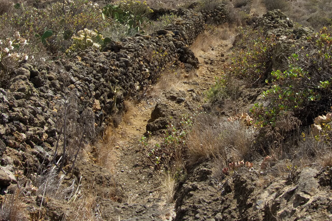 Hier verlassen wir die Straße nach links und wandern entlang einer Trockensteinmauer. Im weiteren Verlauf kommen wir an einem betonierten Strommast vorbei, bevor wir auf der nachfolgenden Asphaltstraße rechts bis zur Hauptstraße vorgehen. Nach 1,3 km, direkt vor einem Überholverbotsschild, verlassen wir die Straße nach rechts. Zunächst ist der Pfad schwer auszumachen. Er führt anfangs parallel zu frisch gepflanzten Bäumen, bis man auf einen Pfad gelangt, der im weiteren Verlauf parallel zum (05) Barranco de la Vieja (579 m) verläuft. Bei einer rotbraunen Wasserpumpstation steigen wir zur Piste hoch und gehen rechts an einem Ziegengatter vorbei. Dann queren wir das Bachbett und wandern oberhalb des Barrancos auf dem Camino de Icota. Bei einem weißen Pumpenhaus queren wir nicht das Barranco. Wir erreichen kurz später den unteren Ortsteil von El Pinar. Durch die Einbahnstraße kommen wir zum Ortskern, um dort links über den Dorfplatz zum Ausgangspunkt zu gelangen.