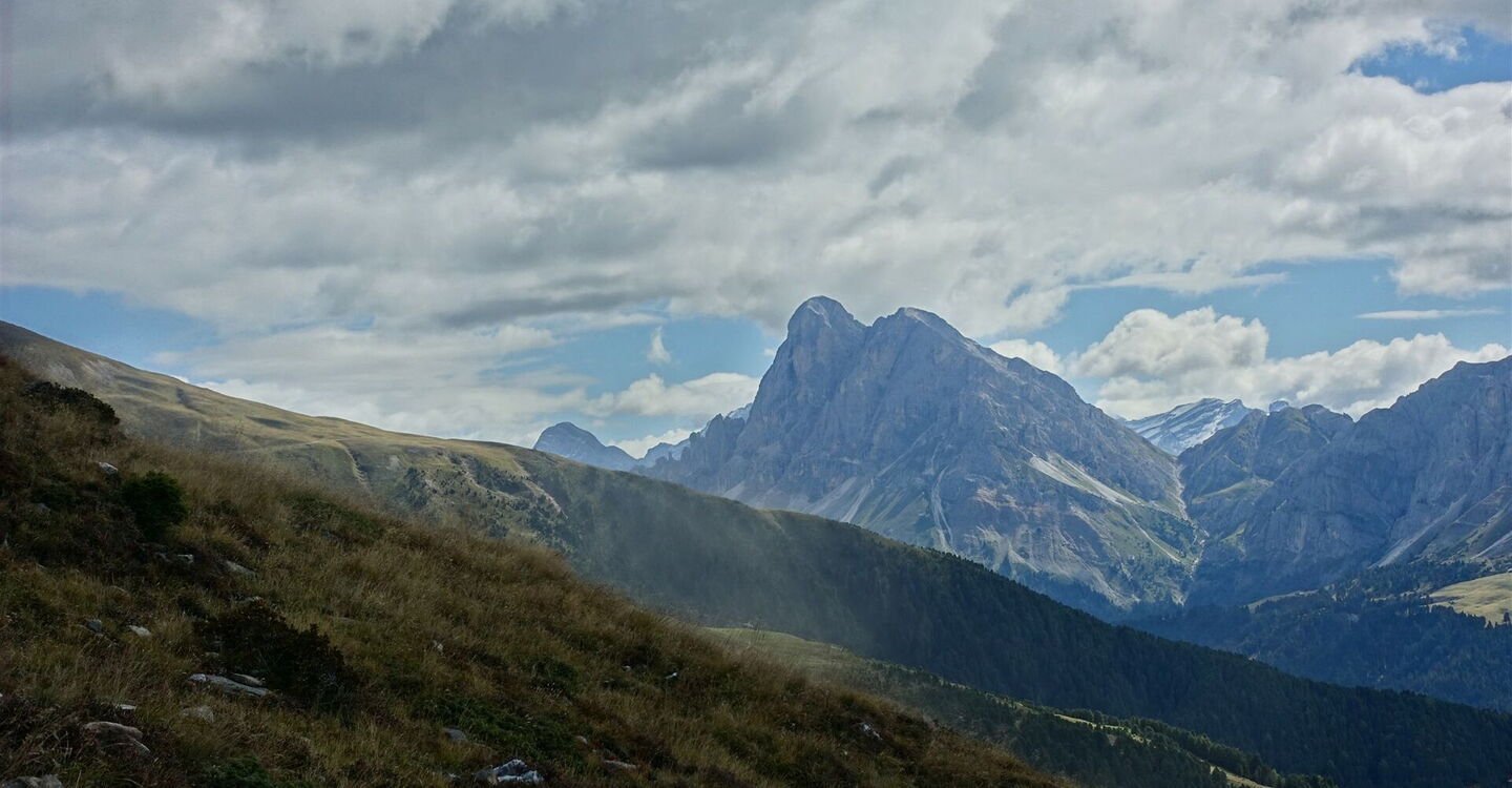 Ca. 30 m hinter einer scharfen Linkskurve, die der Pfad macht – von hier schaut man geradeaus auf den Peitlerkofel –, verlassen wir diesen Pfad nach halb rechts, auch ausgeschildert mit Wanderweg 7. Von hier aus kann man bei gutem Wetter bereits die Plosehütte sehen. Noch einmal gabelt sich der Weg, 04 7 oder 7a (2.307 m)? Das ist hier die Frage.