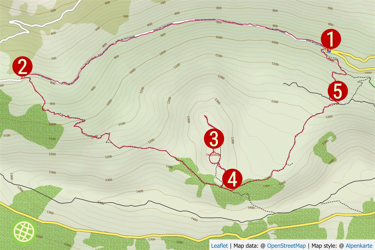Der Weg endet und wir gehen links 100 m auf der (05) Pista Jaranita (1143 m) bergauf, um dann halb rechts auf dem Pfad den Abstieg fortzusetzen. Auf einem schmalen Steig geht es durch den Wald bergab, bis wir die enge Kehre der Hauptstraße erreichen, der Ausgangspunkt der Wanderung.