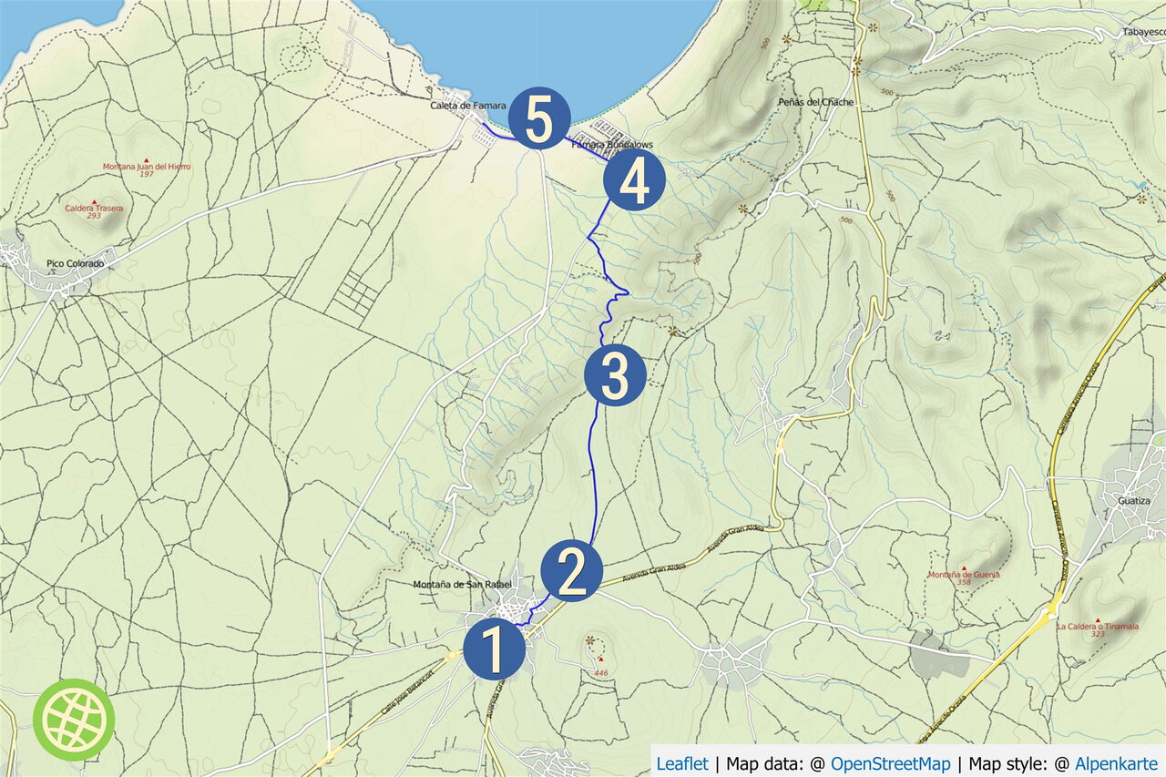 Nachdem man die Straßen und Gassen von Teguise hinter sich gelassen hat, ist die Wegführung eindeutig. Wegbeschaffenheit: 30 % Asphaltstraße, 40 % Schotterweg und 30 % Pfad. Ausrüstungsempfehlung: Bei dieser Tour sollte man auf keinen Fall die Badesachen vergessen. Einkehr: keine auf der Wanderung, aber am Start im Restaurant Cantina in Teguise oder am Ziel Caleta de Famara in verschiedenen Restaurants. Zu jeder Jahreszeit kann diese Wanderung unternommen werden. Tipp: Verbinden Sie die Wanderung mit einer Besichtigung der historischen Stadt Teguise. 500 Jahre Geschichte warten darauf, entdeckt zu werden.