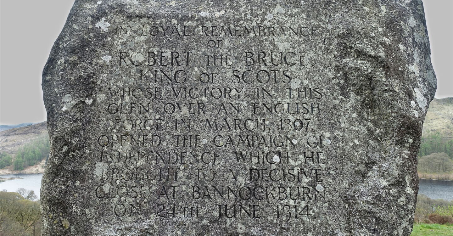 Bevor wir mit der Wanderung beginnen, machen wir noch einen lohnenswerten Abstecher zu dem 1929 errichteten 01 Bruce's Stone (138 m). Dieser Gedenkstein erinnert an die Schlacht, in der Robert the Bruce mit nur 300 Mann eine englische Armee von 1500 schweren Kavalleristen besiegte. Robert the Bruce war von 1306 bis zu seinem Tode 1329 König von Schottland. Dieser erste Kriegsakt war auf lange Sicht der erste Versuch der Engländer, Schottland mächtig zu werden, aber zugleich auch bis heute der letzte Sieg der Schotten über die Engländer.