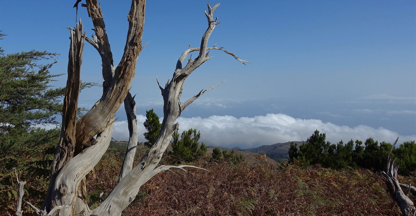 Es folgt ein landschaftlich sehr schönes Wegstück durch einen wohlriechenden Kiefernwald und vorbei an einem künstlich angelegten Wasserreservoir. Der Pfad endet an einer (02) Kreuzung (1047 m), wir gehen geradeaus weiter, auf einem Pfad links entlang einer Mulde. Am Ende der Mulde gehen wir bei der Weggabelung halb rechts, vorbei an Zedernwacholderbäumen. Die Piste wird zu einem mit großen Felsen gesäumten Pfad. Vorbei geht es an einer kleinen Staustufe und durch ein Waldstück, bis wir die Piste erreichen. Nachdem wir 215 m auf dieser bergauf gegangen sind, halten wir uns bei der darauffolgenden Weggabelung halb rechts und ignorieren den linken Abzweiger zum Heiligen Baum Arbol Garoe.