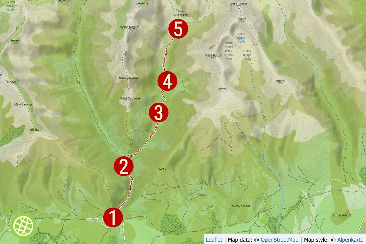 Start: Der Start liegt 24 km nordöstlich von Liptovský Mikuláš bei dem Hotel Horská Chata Orešnica, in der Nähe des Eingangs zur Úzka Dolina. GPS: 49.132900 19.789700. Busanbindung: Keine.