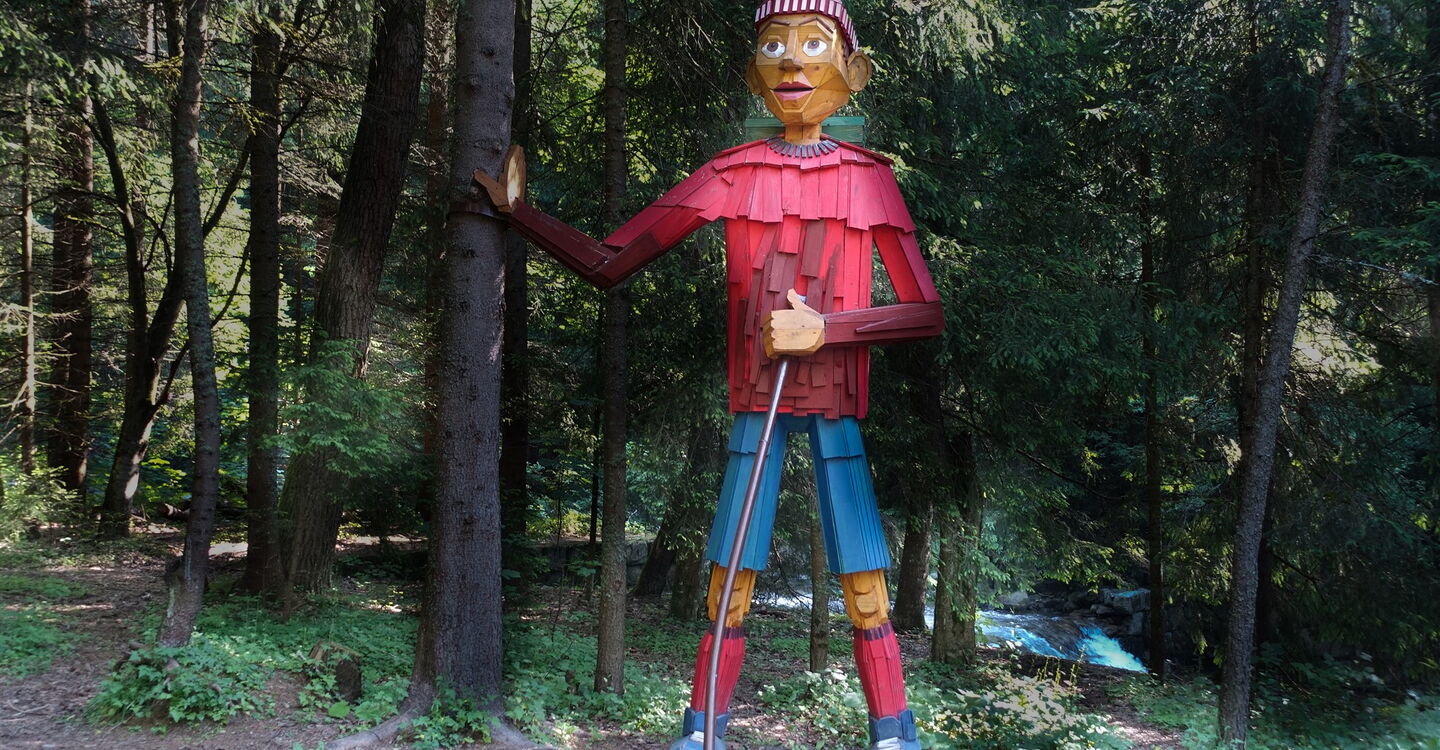 Vom großen Parkplatz am Hotel 01 Horská Chata Orešnica (875 m) gehen wir auf der Anfahrtsstraße bergab, bis wir die große Holzfigur erreichen. Vor der Brücke und den Wegweisern gehen wir halb links in die Úzka Dolina.