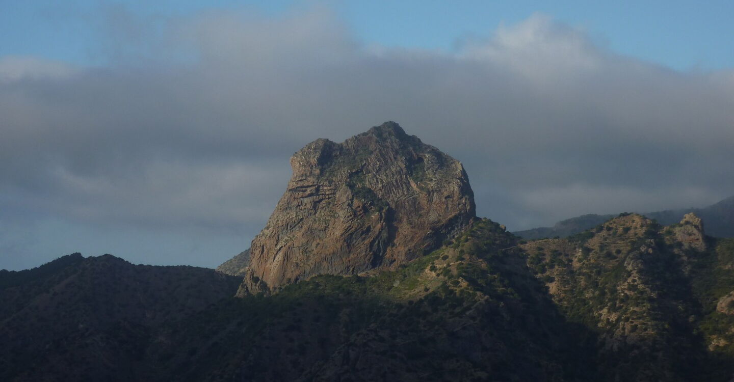 In einer 180-Grad-Linkskehre der Schotterpiste verlassen wir diese nach rechts Richtung Hermigua. Kurz hinter den ersten Häusern von Tamagarda endet der Weg und wir gehen rechts Richtung Vallehermoso. Sobald wir eine Wegverzweigung mit drei Wahlmöglichkeiten erreichen, nehmen wir den Pfad mit der Wegbeleuchtung. Nach einem kurzen Stück auf einer Asphaltstraße verlassen wir diese in der folgenden Linkskehre bereits wieder, um nach rechts auf einen wunderschön angelegten Wanderweg einzuschwenken. Nach der Überschreitung eines Bergrückens steht imposant direkt vor uns der 220 m höhere Felskoloss (05) Roque Cano (439 m). Nach einem steilen Abstieg gehen wir rechts talauswärts und erreichen bald einen Abzweiger nach links Richtung Vallehermoso. Diesen ignorieren wir aber und gehen rechts über die Terrassenfelder, bis wir die Asphaltstraße erreichen, die uns zum Parkplatz führt.