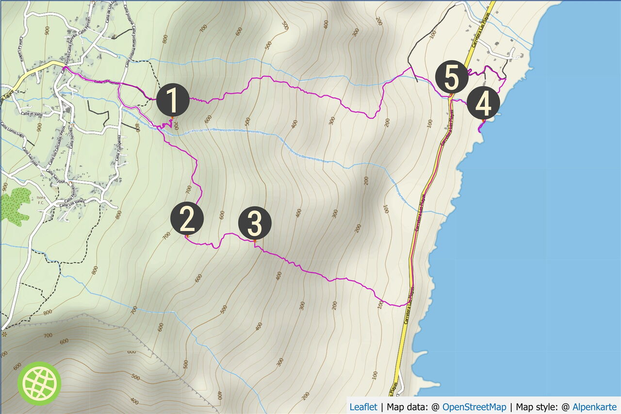 Im nachfolgenden Streckenverlauf kreuzen wir dreimal die Straße. An der Küste kann man das Dorf (02) La Caleta (110 m) ausmachen. Wir gelangen an eine Schlüsselstelle: Der Pfad führt parallel zu einer Stromleitung und sobald der Weg rechts unter diese Stromleitung führt, gehen wir aber halb links – auch wenn der Weg gelb-weiß ausgekreuzt ist. Nach weiteren 100 m ist der Camino von Steinen gesäumt. Bei der nachfolgenden Weggabelung gehen wir halb links bergauf. Wir gehen links an dem gelben Gebäude vorbei und queren die betonierte Piste, es geht leicht bergauf und wir lassen das darauffolgende Haus links liegen. In der nachfolgenden Rechtskehre der Piste folgen wir dem halbrechten der beiden abzweigenden Pfade.